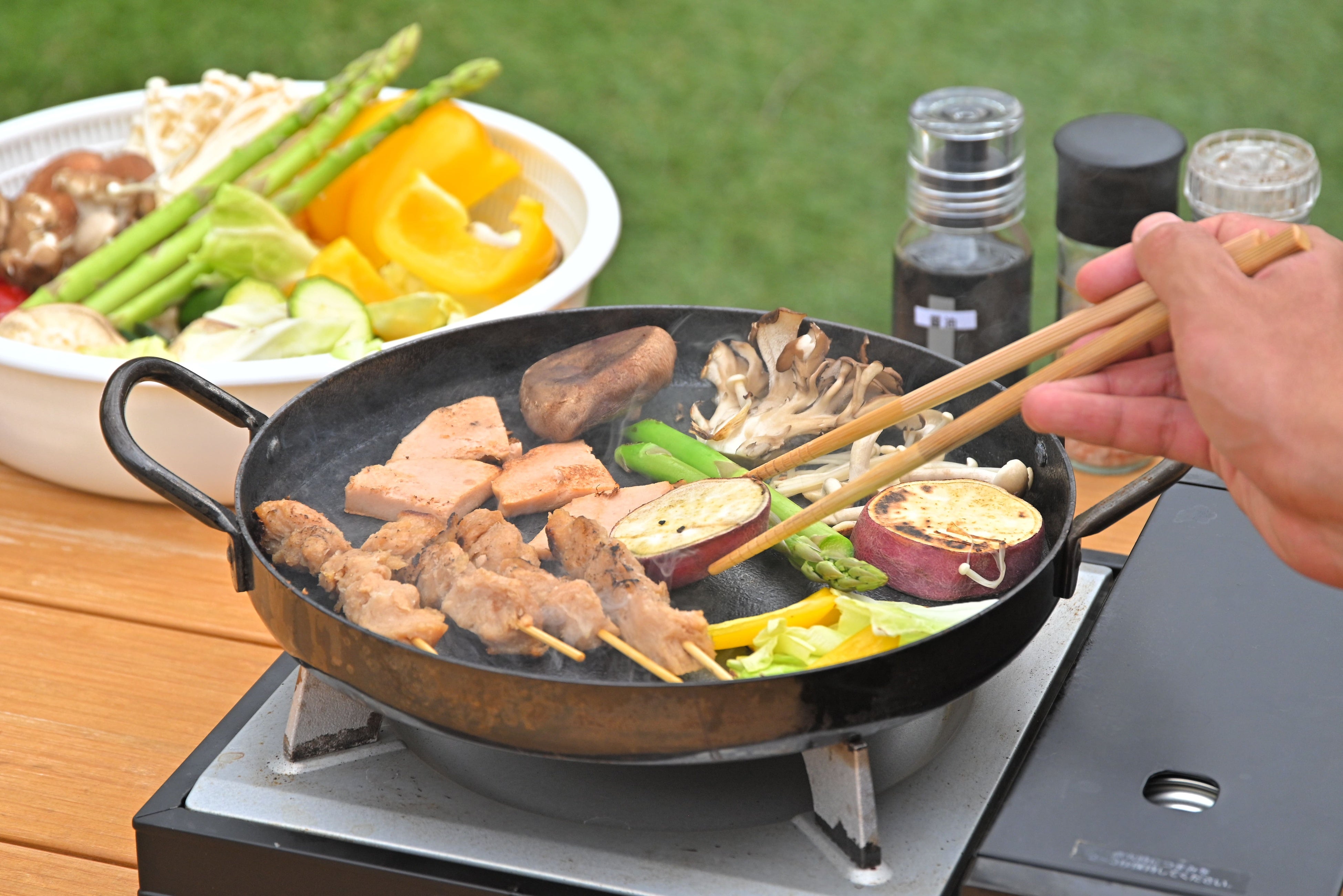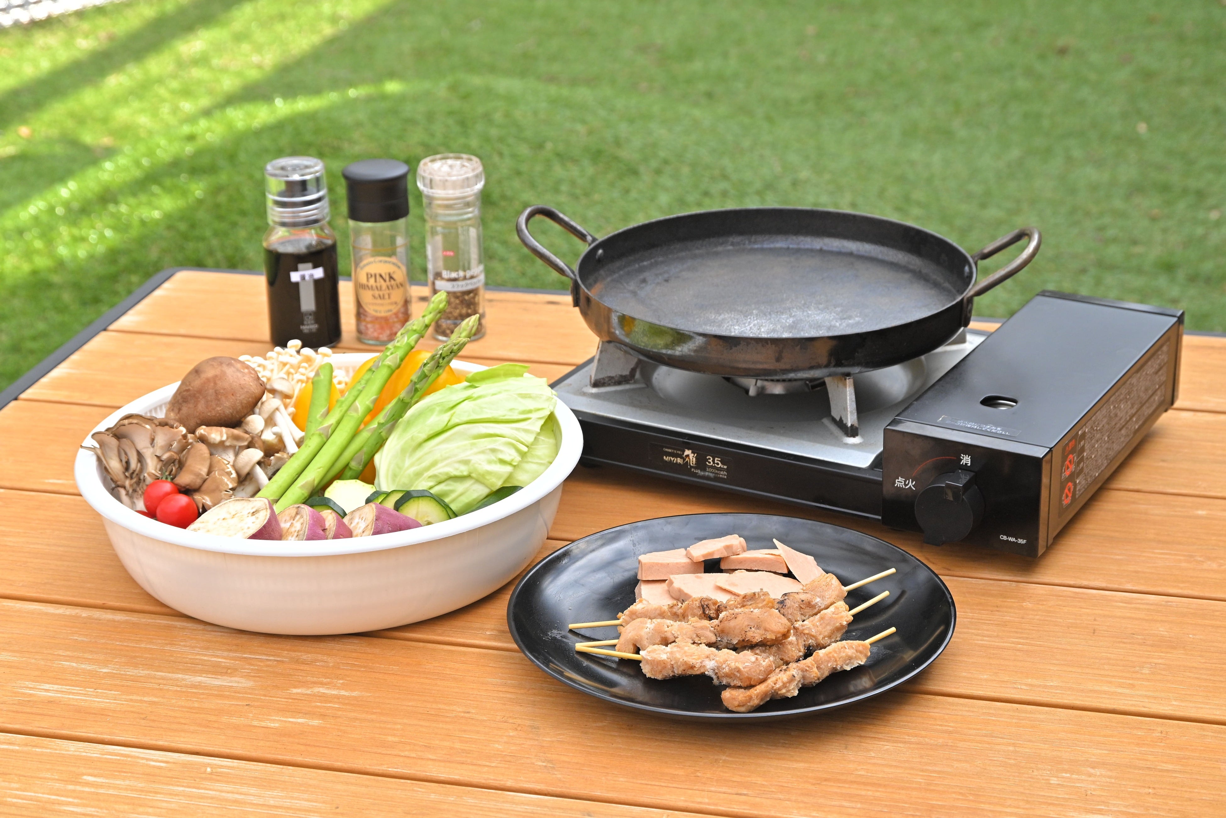 1本ずつ秘伝のタレで焼き上げた大豆ミートの串焼きや、食べ応えのあるジューシーな大豆ミートのステーキ、新鮮なお野菜をバーベキュースタイルでお楽しみいただけます。