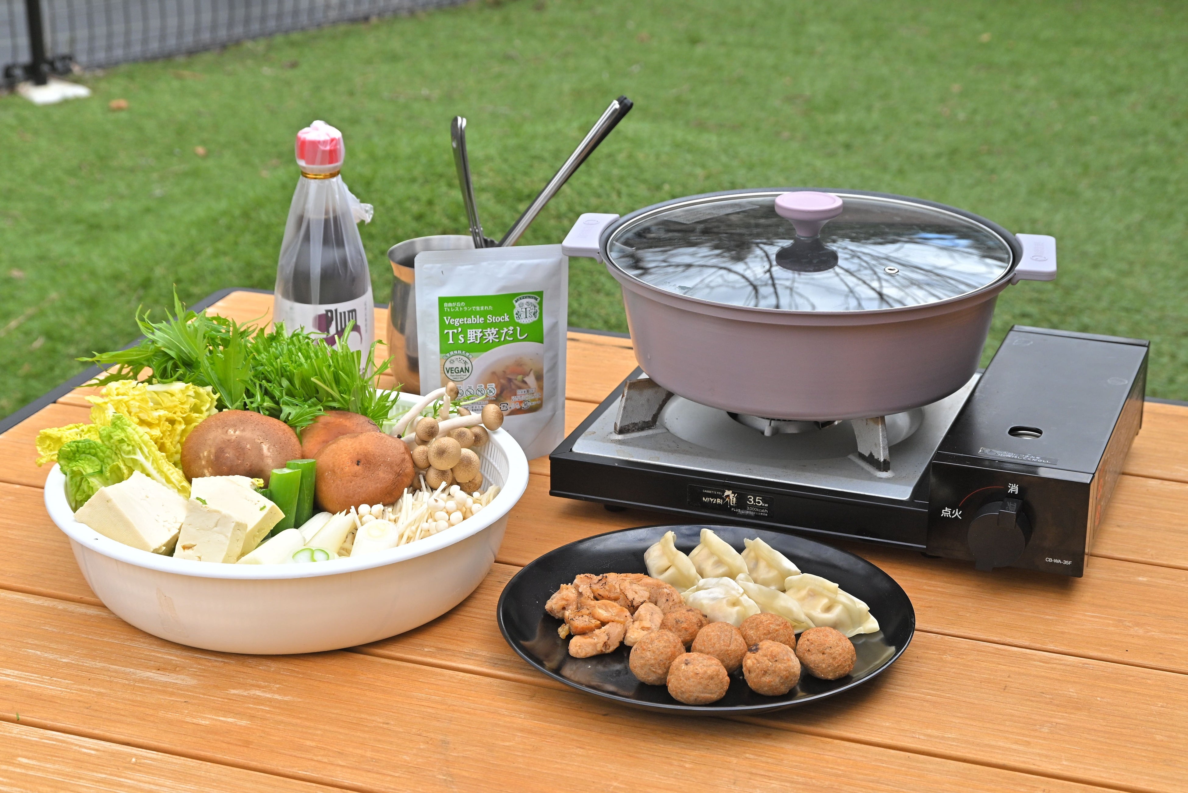 新鮮な野菜と大豆ミートのミートボール、水餃子などを、やさしいお出汁でグツグツと煮込みました。梅ポン酢で味付けしてお楽しみいただけます。