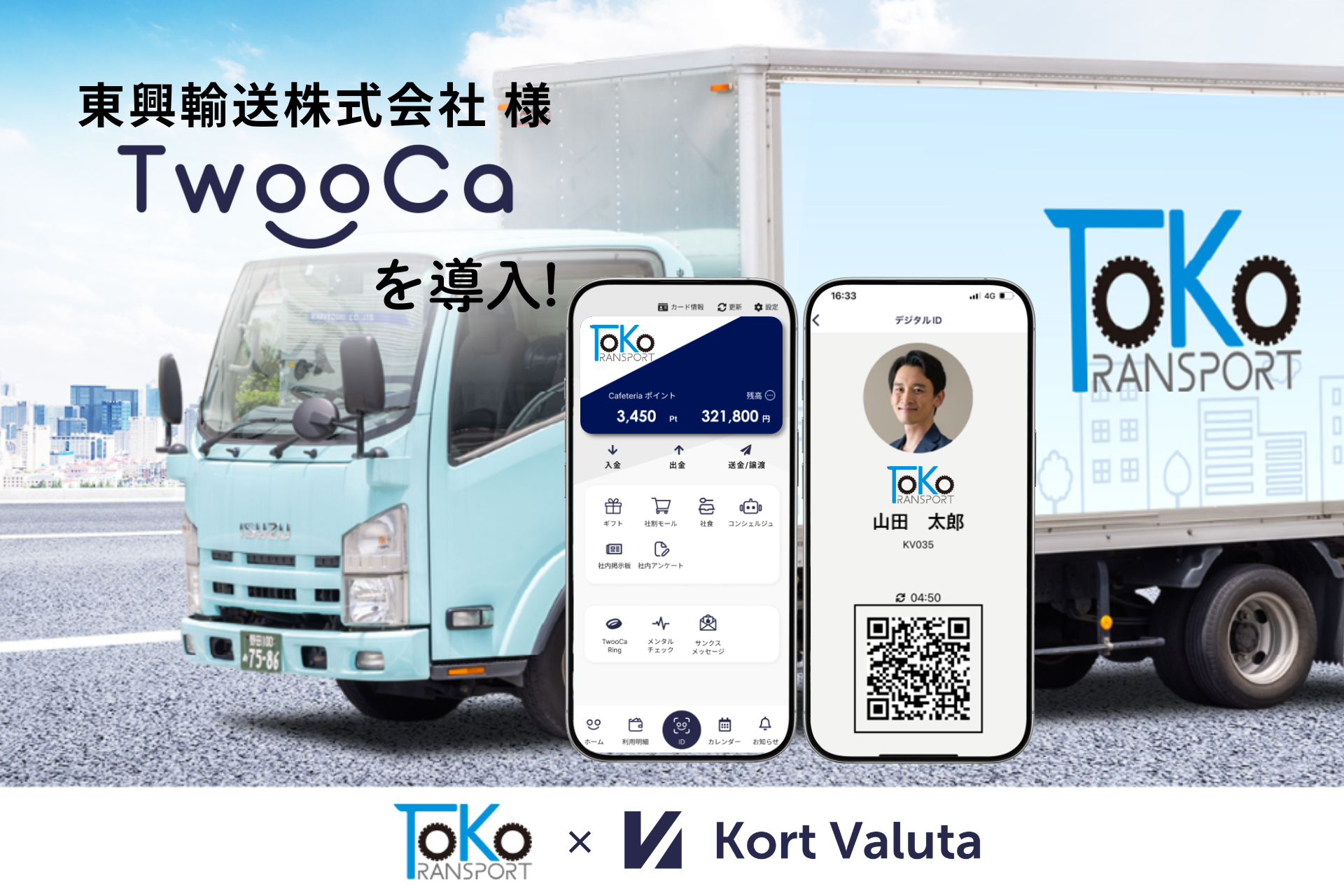 株式会社Kort Valuta(本社:東京都渋谷区、代表取締役:柴田秀樹、以下「当社」)は、東興輸送株式会社(本社:千葉県流山市、代表取締役:西村秀人、以下「東興輸送」)がドライバーの離職防止および採用強化を目的として、次世代型*1ウォレット「TwooCa(ツウカ)」を導入したことをお知らせいたします。
