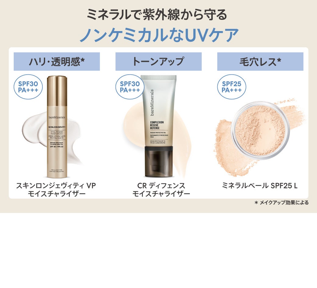 そんな肌がゆらぎやすい季節、マイルドな処方のベアミネラルから、シンプルで時短な透明感*メイクが叶う「インスタント アプリ肌」を提案します。
