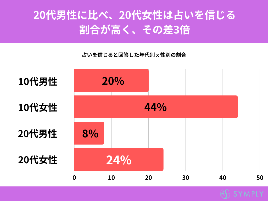 【20代男性に比べ、20代女性は占いを信じる割合が高く、その差3倍】