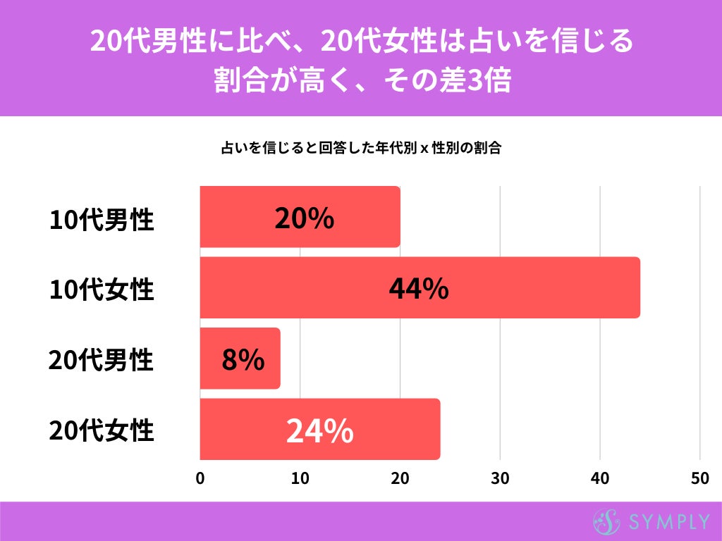 女性のほうが占いを信じる方が多い傾向にあり、20代女性は20代男性の3倍もの方が占いを信じているという結果になりました。