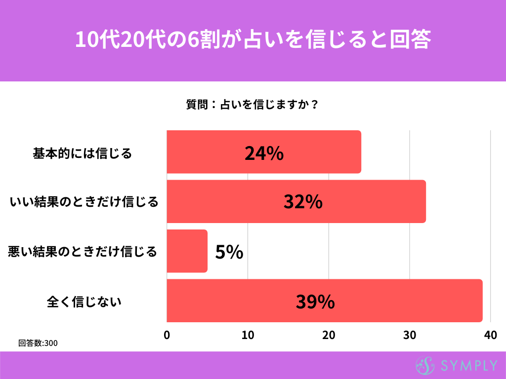 10代〜20代の男女を対象とした「占いを信じますか?」というアンケートで最も多かった回答は「全く信じない」で39%でした。