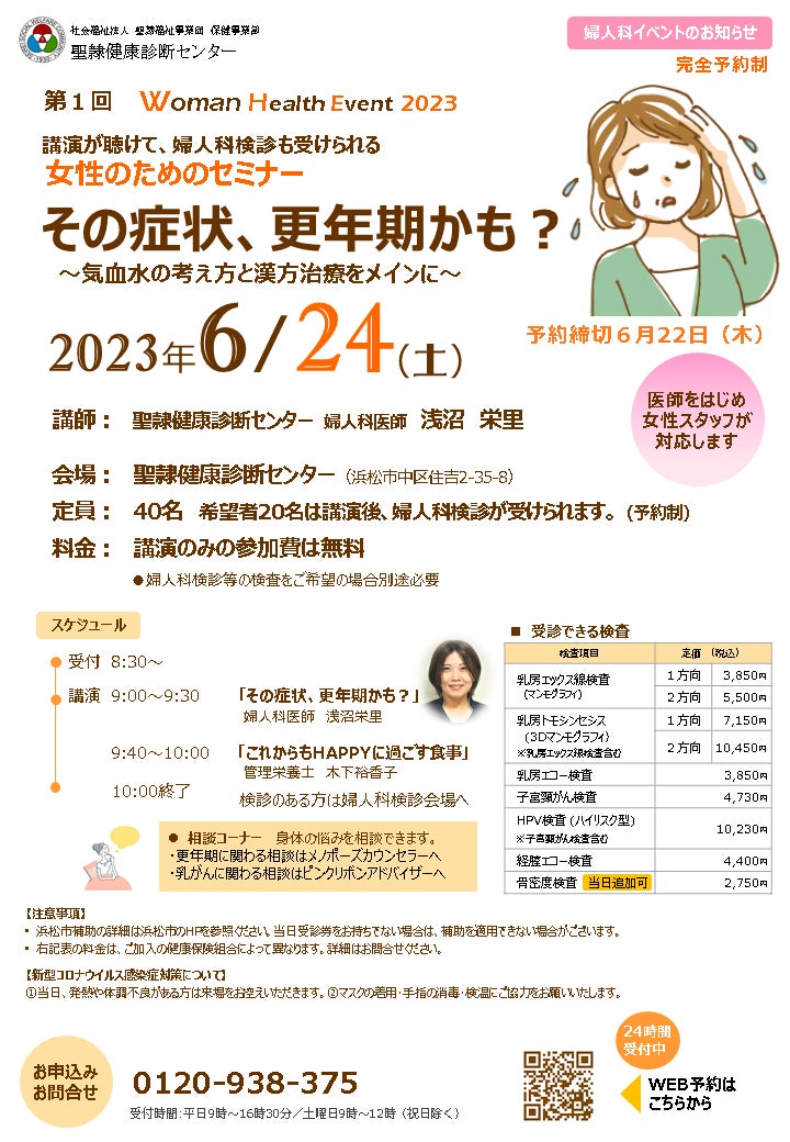 「その症状更年期かも?」2023年6月24日(土)講演が聴けて、婦人科検診も受けていただける 女性のためのセミナーを開催
