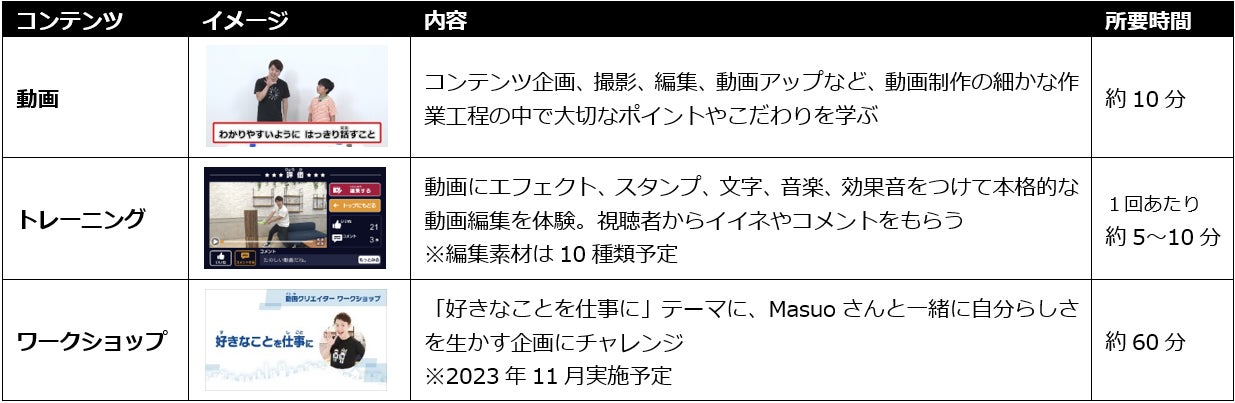 本サービス提供開始1周年にあわせて追加となる「動画クリエイター」コース(以下 本コース)では、こども達のなりたい職業ランキングの定番である動画制作の仕事を、第一線で活躍する日本一身近な動画クリエイターのMasuoさんと一緒に学ぶことができます。本コースでは、自分らしさを最大限に活かすためのコンテンツ作りや視聴者にわかりやすく伝えるための工夫など、動画クリエイターの仕事における大切なポイントやこだわりについて学んだあと、実際にエフェクトや音楽などを施して本格的な動画編集を体験します。