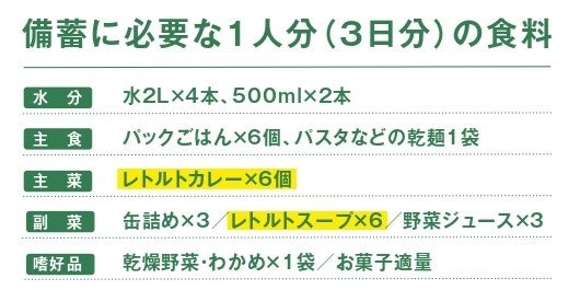 備蓄に必要な1人分(3日分)の食料を参考に、家族の人数に応じてご購入をおすすめします。