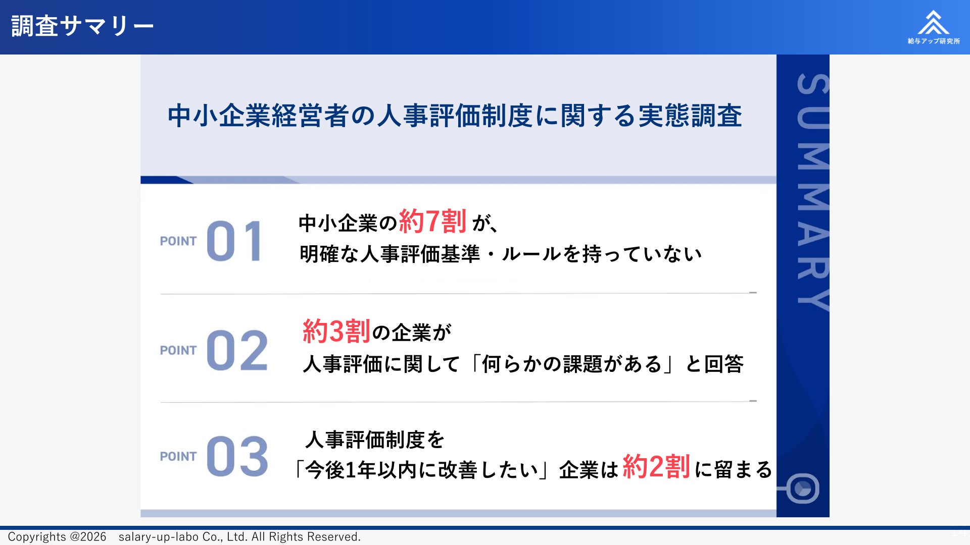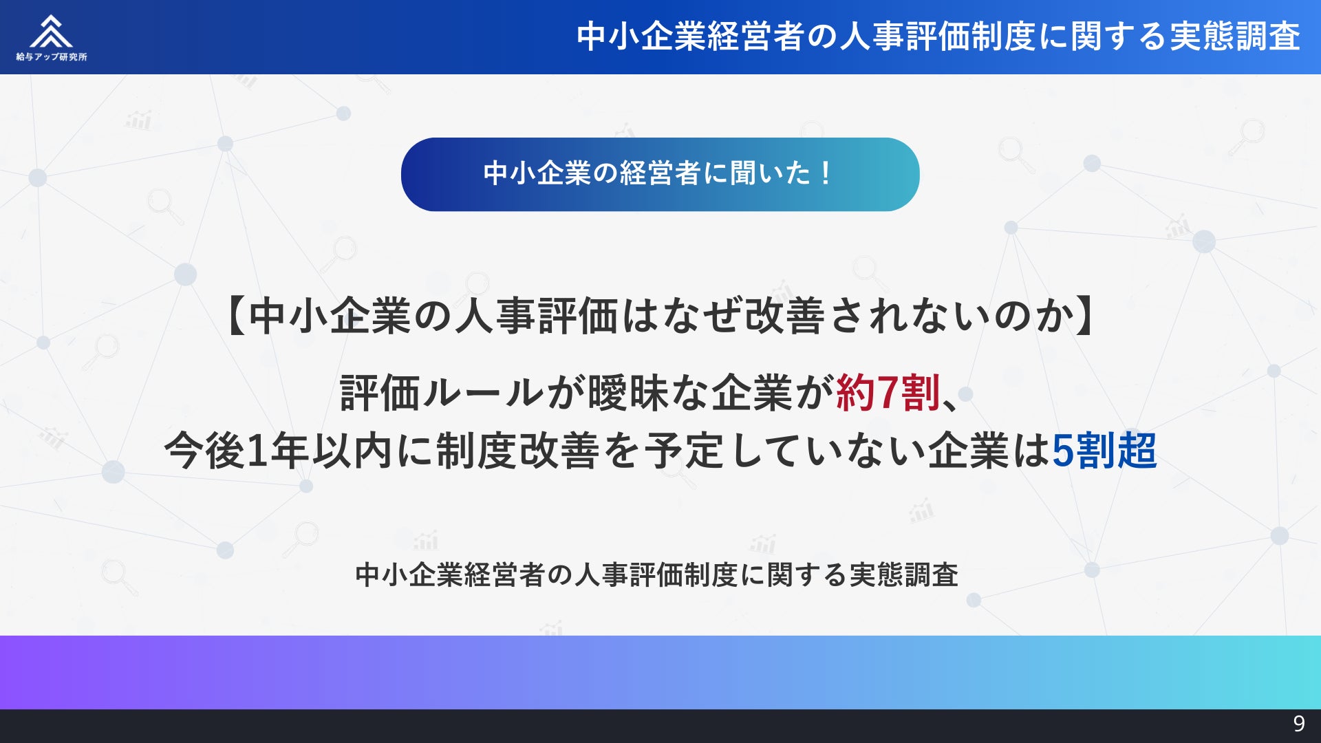 冒頭では、給与アップ研究所が実施した中小企業向け実態調査データが共有されました。