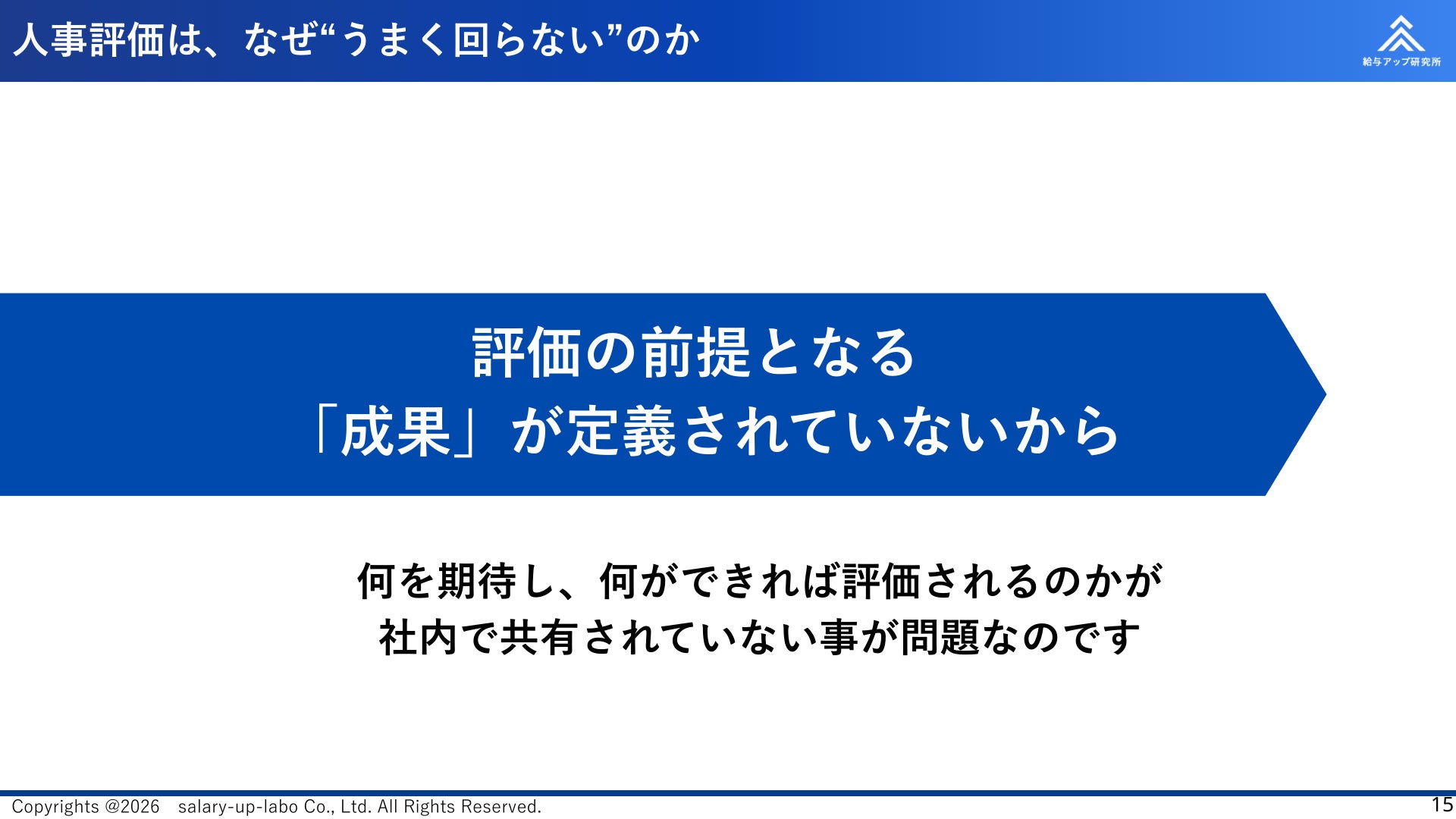 セミナーでは、「評価制度が形骸化してしまう最大の原因は、“成果”の定義が曖昧であること」と指摘。