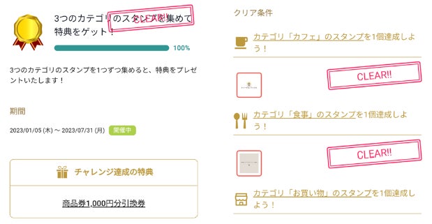 「チャレンジスタンプラリー」は、指定された条件(チャレンジ)を達成した顧客にお得な特典を付与する機能です。「食事・カフェ・ファッションに該当する店舗を1店舗ずつ、計3店舗利用する」「14:00〜18:00の間に3店舗を利用する」などの条件は、LINEアプリ上のマイグルの「チャレンジ」タブから確認が可能です。