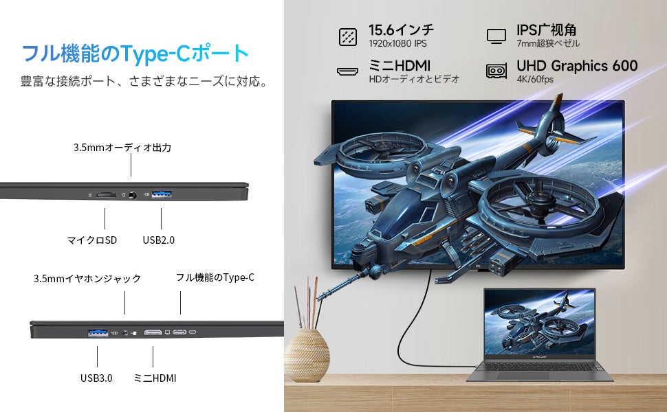 | 各端子 | フル機能Type-C*1、USB 3.0*1、USB 2.0*1、Mini-HDMI*1、3.5mmオーディオ出力、Micro SD スロット、3.5mm DCポート |