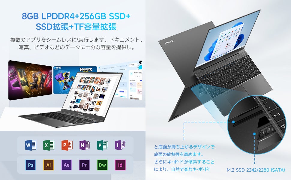 SDカードとM.2(SATA)SSD交換拡張をサポートします。大容量PCとしても活躍します。(SDカードとSSDを別売りください)、より多くのスペースを楽しむこともできます。