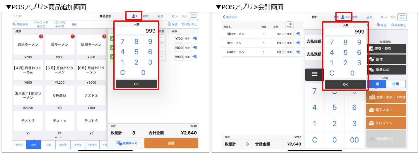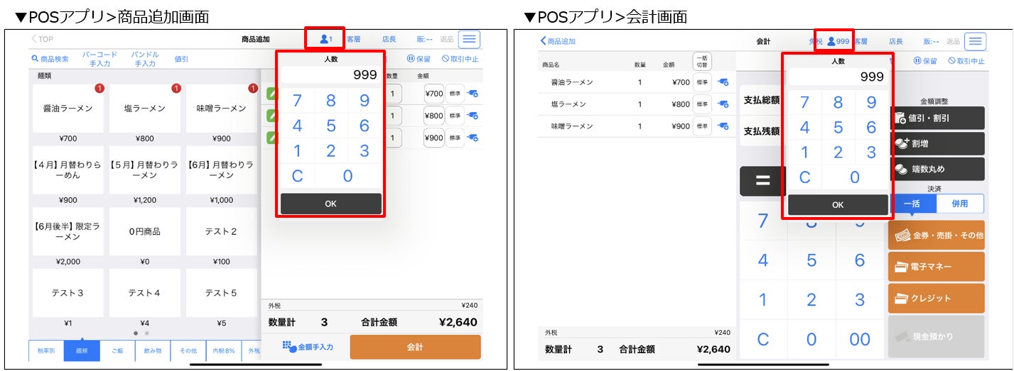 注文機能なし設定時の客数登録数を変更できるようになりました。従来の機能では客数「1」の設定しかできなかったところ、今回のアップデートで最大「999」まで登録が可能となりました。また、点検精算レシートおよび電子ジャーナルへ客数表示されるようになります。