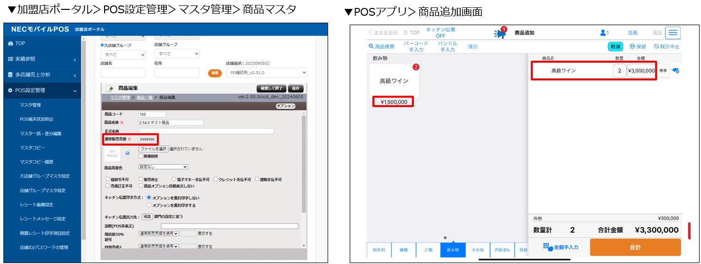 これまでは1会計あたりの合計金額の上限は9,999,999円まで設定ができましたが、今回のアップデートで商品マスタ単価の上限も9,999,999円まで設定できるようになりました。