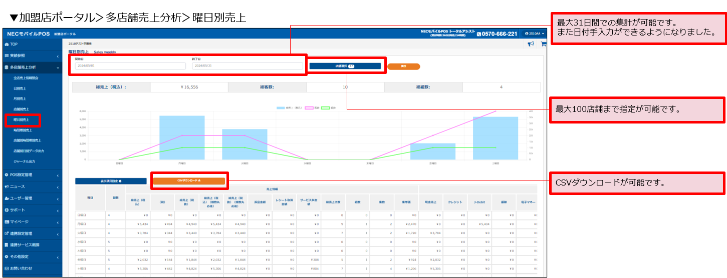 複数店舗を指定して表示可能な曜日別売上集計画面を新設しました。最大100店舗、31日間を指定することが可能です。