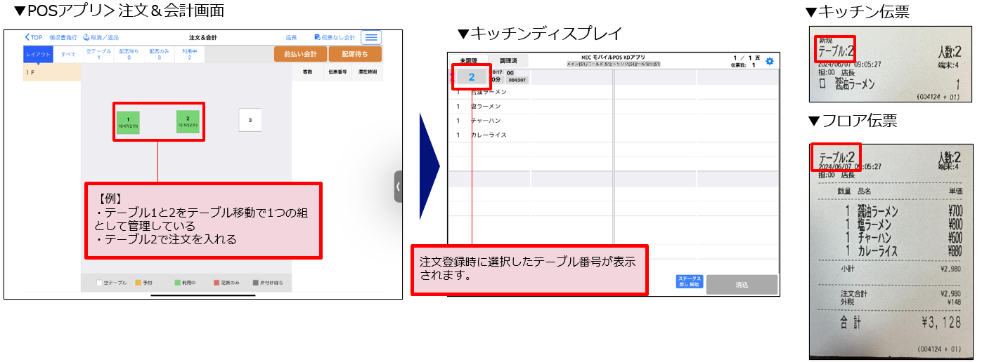 複数卓を同一伝票で配席している場合でも、注文登録時に選択したテーブル番号がキッチン伝票、フロア伝票、キッチンディスプレイに表示されるようになりました。なお、キッチンディスプレイアプリ、POSアプリ、Orderアプリ、SelfOrderアプリ、それぞれのアプリのアップデートが必要となります。アップデートができていない場合、印字された伝票とキッチンディスプレイのテーブル番号に差異が発生する可能性があります。