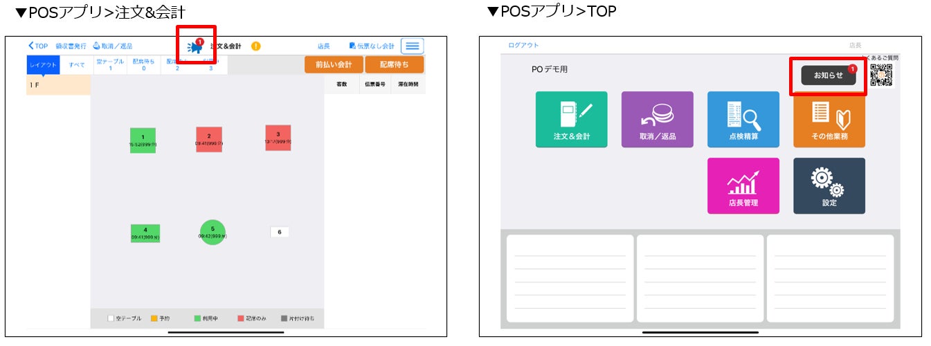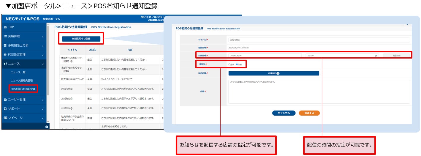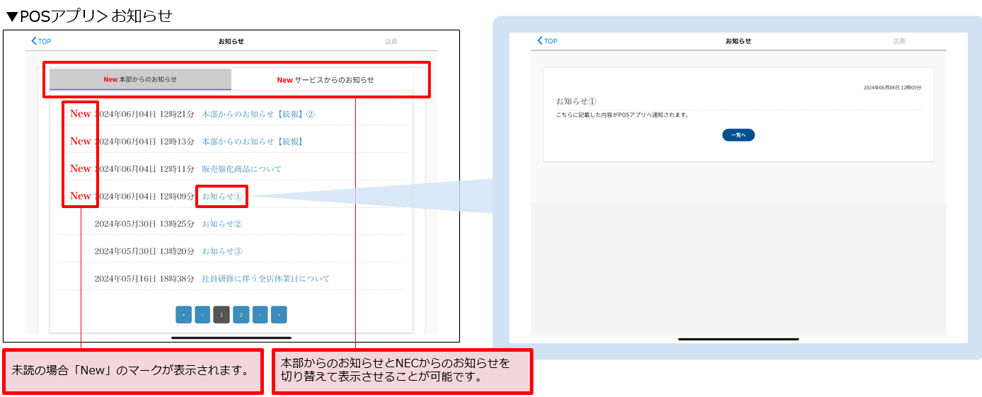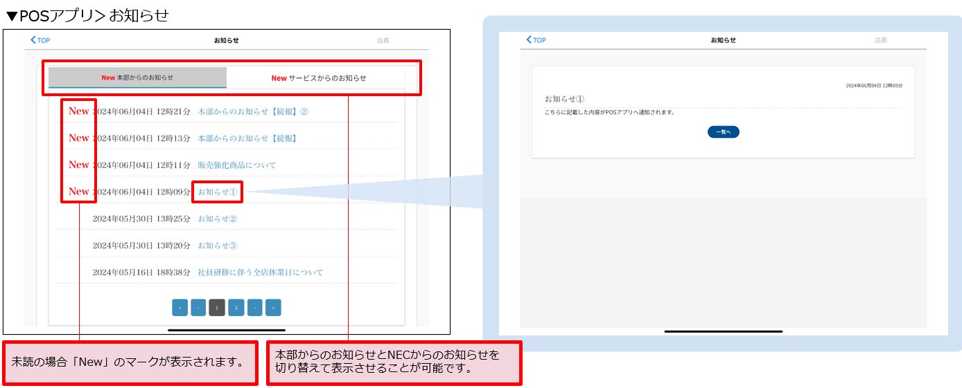 本部からの『お知らせ』などを現場のPOSアプリに通知できるようになりました。