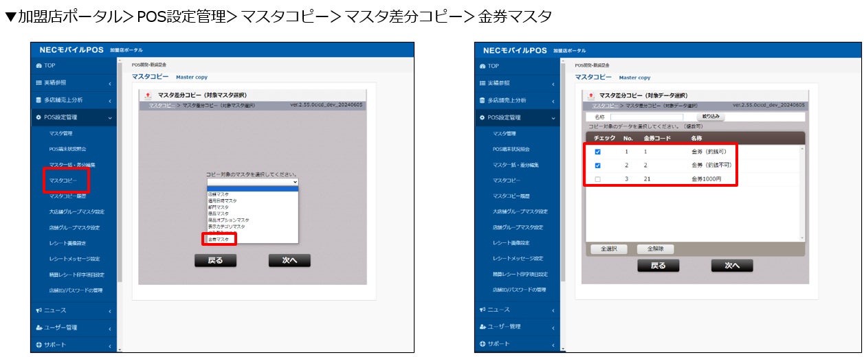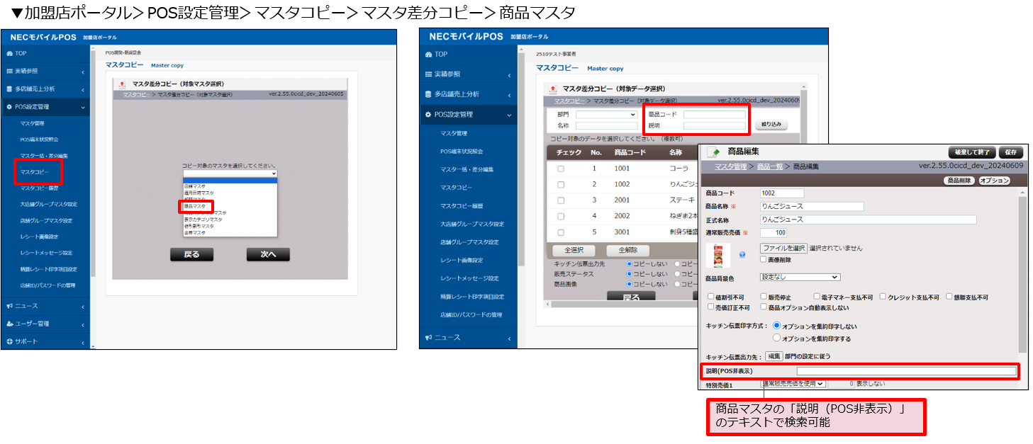 マスタ差分コピーで店舗マスタの特定項目を指定してコピーできるようになりました(全ての項目をコピーしたい場合は、全選択のボタンを押下の上、コピーすることが可能です)。また、商品マスタの差分コピー時に商品コードまたは商品説明でコピー対象を検索することが可能になりました。なお、金券コードに対して差分コピーがかかるため、上書きする際は注意が必要です。