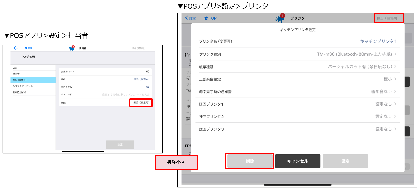 担当者(編集可)の権限において、キッチンプリンタマスタの削除ができないよう制限しました。これにより、現場の方が誤ってマスタを削除するリスクを低減します。