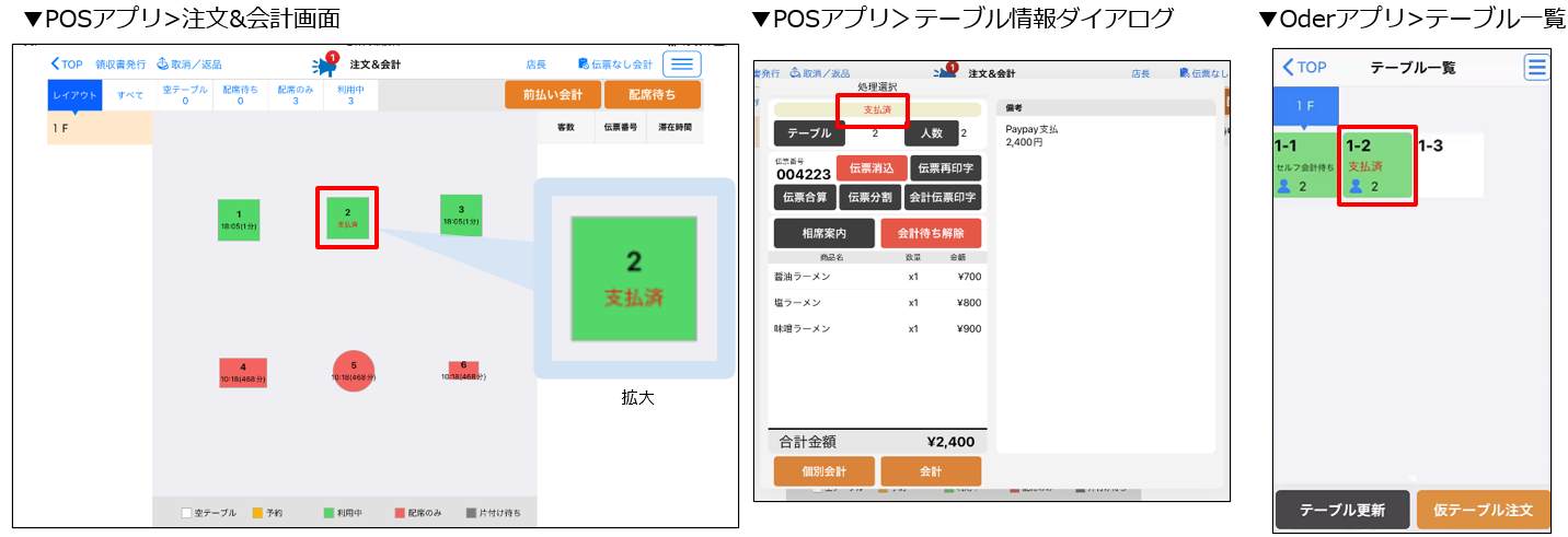 店内モバイルオーダーで決済が完了している場合、POSやOrder側で「決済済み(支払済)」であるか否かをPOS画面、Order画面で確認できるようになりました。なお、モバイルオーダーで「決済済(支払済)」であることをPOS、Orderアプリで表示するための機能となるため、POSアプリでの会計処理を引き続き行う必要があります。