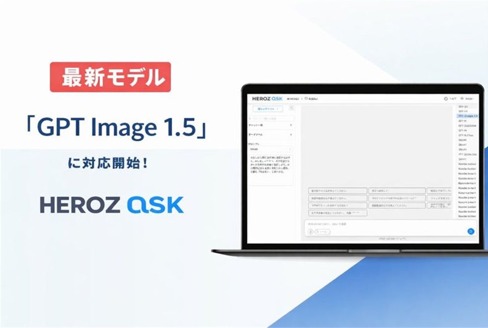 HEROZ株式会社(本社:東京都港区、代表取締役CEO:林 隆弘、以下「HEROZ」)は、法人向け生成AI SaaS「HEROZ ASK」において、2025年12月16日に発表されたOpenAI社の最新画像生成モデル「GPT Image 1.5」への対応を完了しました。本機能は、2025年12月25日より提供を開始しております。「HEROZ ASK」は、今後も最新モデルへの迅速な対応を継続し、お客さまにより高い生産性と利便性を提供してまいります。