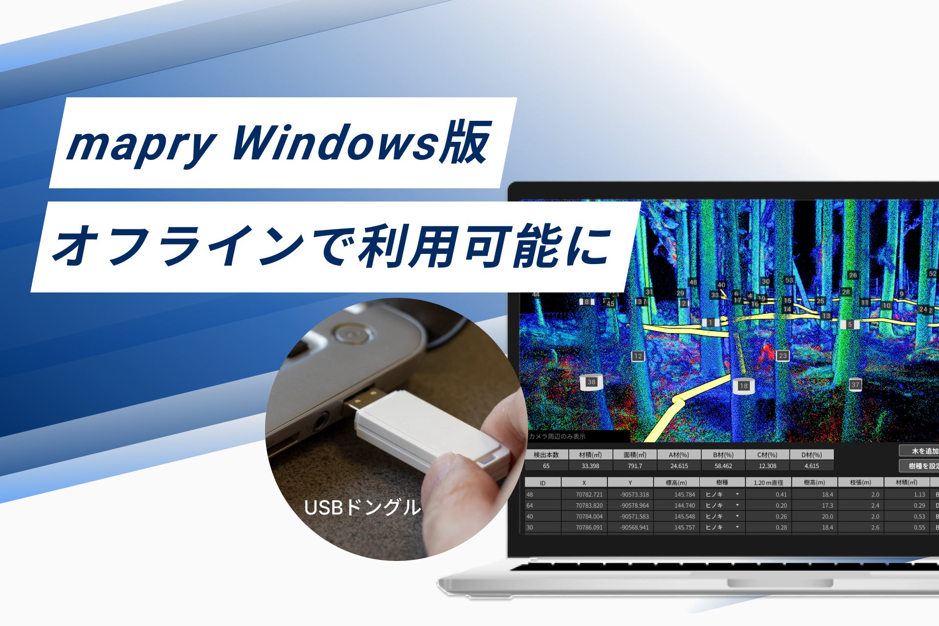 株式会社マプリィ(本社:兵庫県丹波市、代表取締役:山口圭司、以下マプリィ)は、3D点群データの解析・活用ソフト「mapry Windows版」において、ネットワーク環境がなくても利用可能になる「USBドングル版(物理プロテクトキー)」の提供を開始いたしました。
