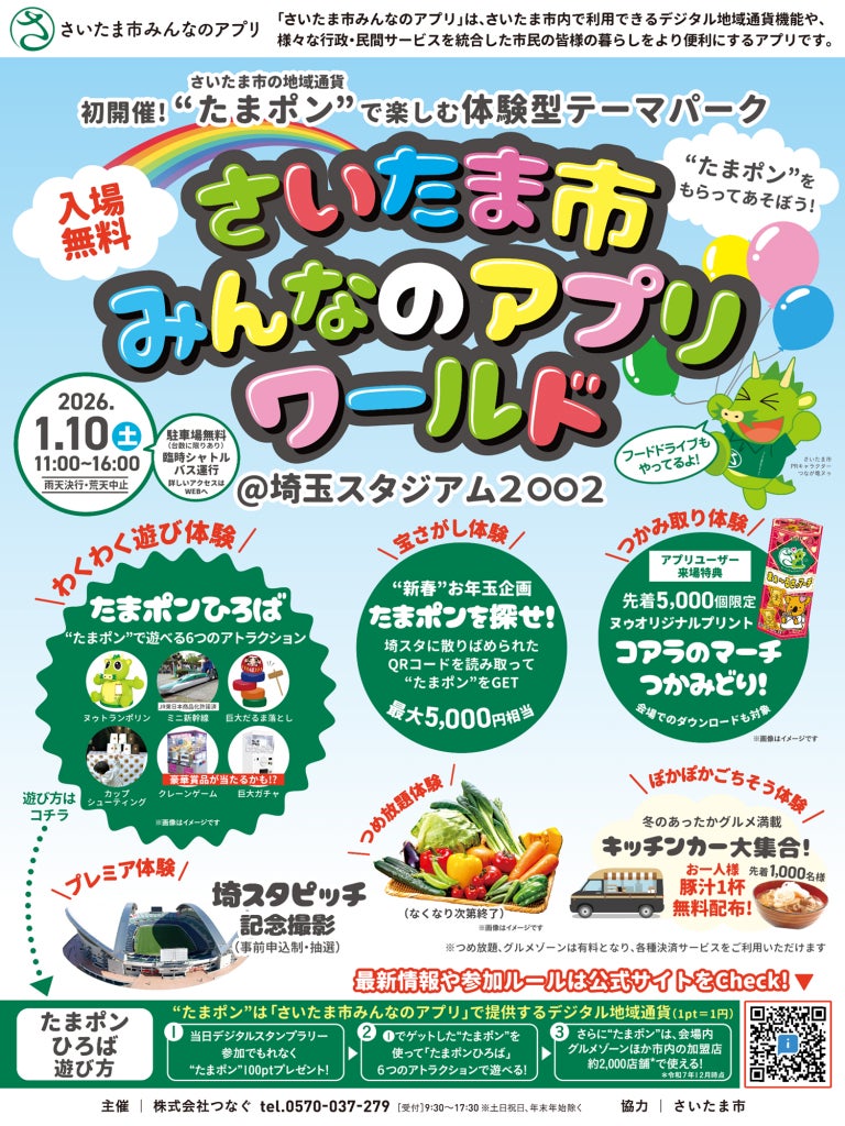 この度、株式会社つなぐ主催による初の大型体験イベント「さいたま市みんなのアプリワールド」が2026年1月10日(土)、埼玉スタジアム2〇〇2にて開催されます。