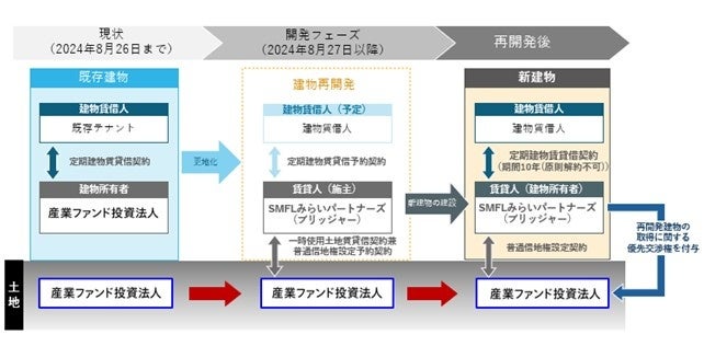 本事業は、産業ファンドが所有する既存建物を解体し更地化した後、SMFLみらいパートナーズが産業ファンドより土地を賃借した上で、新たな物流倉庫を建築します。物流倉庫の完成後、一定期間保有した上で将来、産業ファンドに本物件を組み入れることを企図したブリッジ機能を提供することにより、本物件のバリューアップを実現します。本物件は、未消化容積率・未消化建蔽率が大きく存在するため、再開発ポテンシャルが非常に高い物件です。SMFLみらいパートナーズが本事業に参画しブリッジ機能を提供することで、産業ファンドは再開発期間中の収益ダウンタイムや解体費などの費用負担を回避し、建替え再開発を推進することが可能となります。