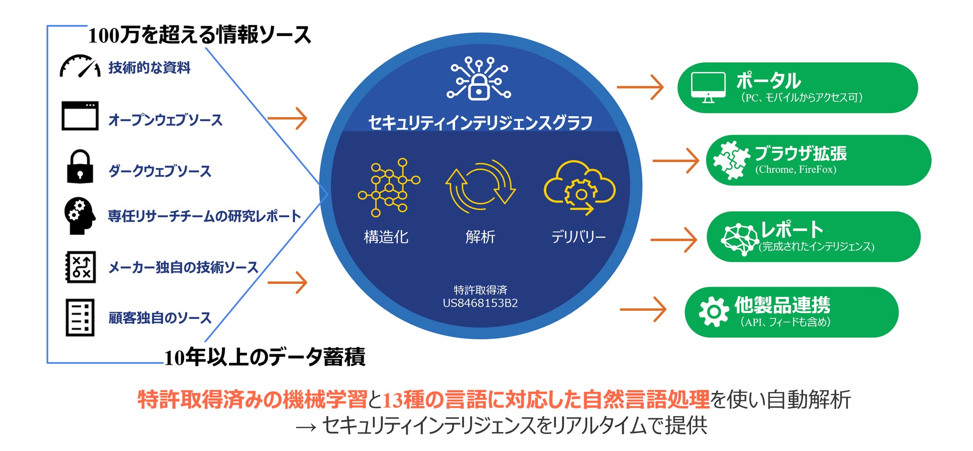 セキュリティ脅威インテリジェンス「Recorded Future」は、ダークウェブをはじめ通常ではアクセス困難なインターネット領域の情報も収集可能なサービスです。様々な言語で記述された膨大な情報からパターンや文脈を分析し、インテリジェンスを提供します。その情報収集力を強みとしており、100万を超える情報ソースから毎日5,000万以上のドキュメントを収集し続けています。
