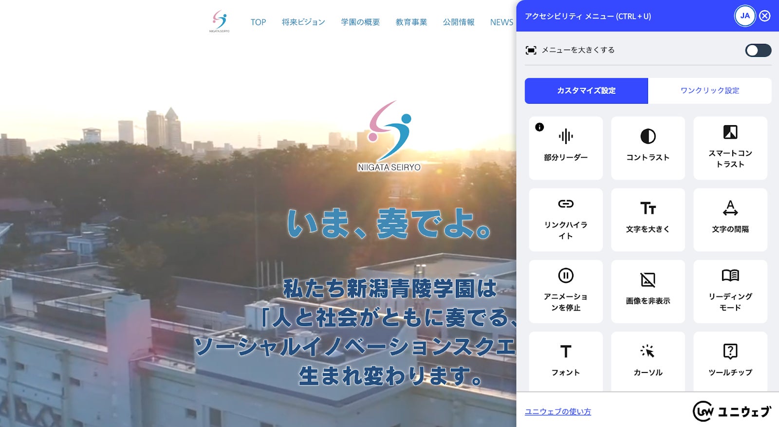 アイコンをクリックすると、アクセシビリティメニューが表示され、文字を読み上げてくれる部分リーダーや画面のコントラスト切り替えなどがボタン1つで可能です。