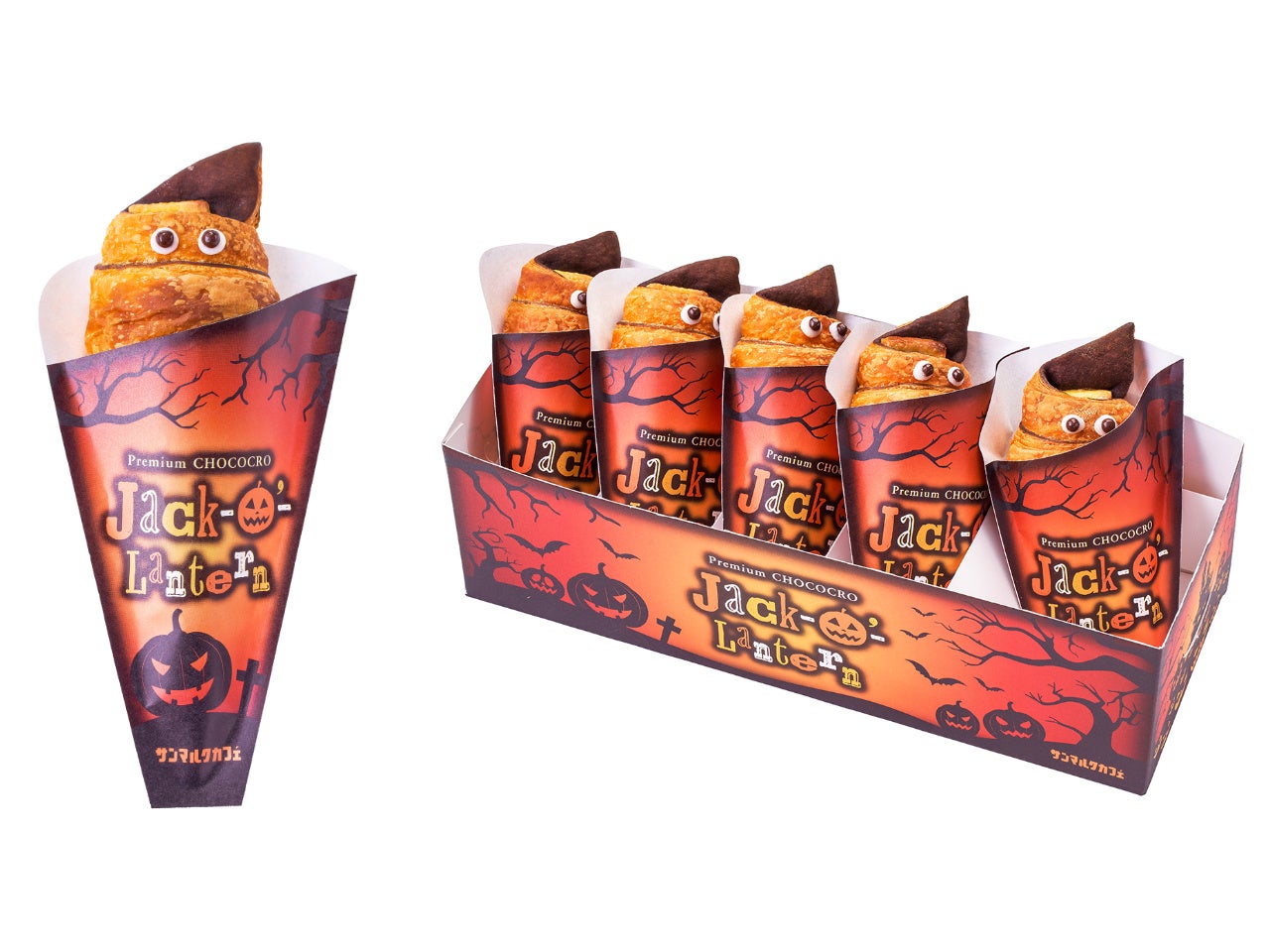 「プレミアムチョコクロ 安納芋のジャック・オー・ランタン」は、安納芋の焼き芋パウダーを練り込んだオレンジ色の生地とチョコレートを練り込んだ黒色の生地のバイカラークロワッサン生地を使用し、ジャック・オー・ランタンを表現したプレミアムチョコクロ。安納芋を使用したホワイトチョコレートと安納芋の濃厚なクリームをバイカラー生地で包みこみ焼き上げました。外側にはおばけの目玉のようなチョコレートをトッピングしており、スリーブからおばけの顔が覗く、可愛らしい見た目となりました。