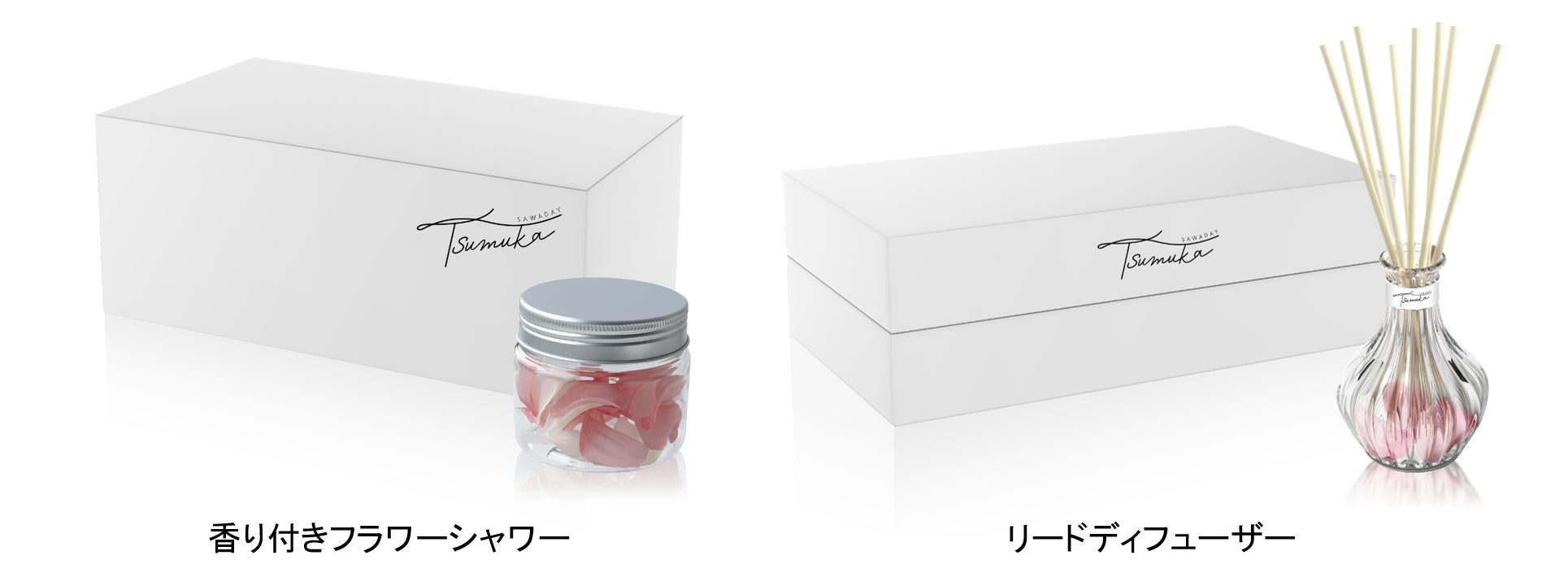 『Sawaday TSUMUKA』は、結婚式のフラワーシャワーに新郎新婦がセレクトした香りをつけ、その香りに特別な思い出を持って頂き、挙式1周年に同じ香りのリードディフューザーをご自宅にお届けすることで、「香り」によって日常生活の中で幸せなシーンを思い出して頂く国内初※の結婚式演出サービスです。