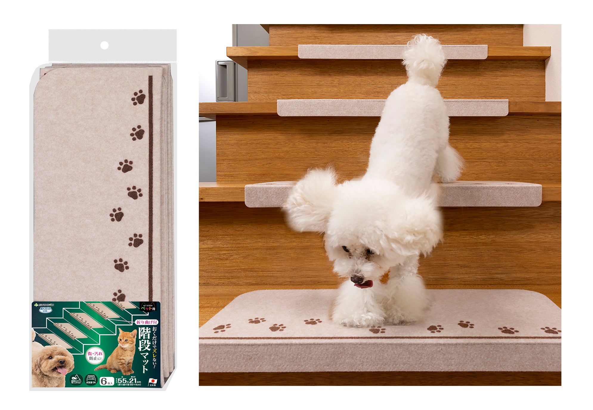 今回のイチオシ商品「おくだけ吸着階段マット 肉球」は、裏面吸着加工で付け外し簡単!肉球プリント柄部分はすべり止め加工で安心です。汚れたら洗濯機で洗えるのも嬉しいポイント♪