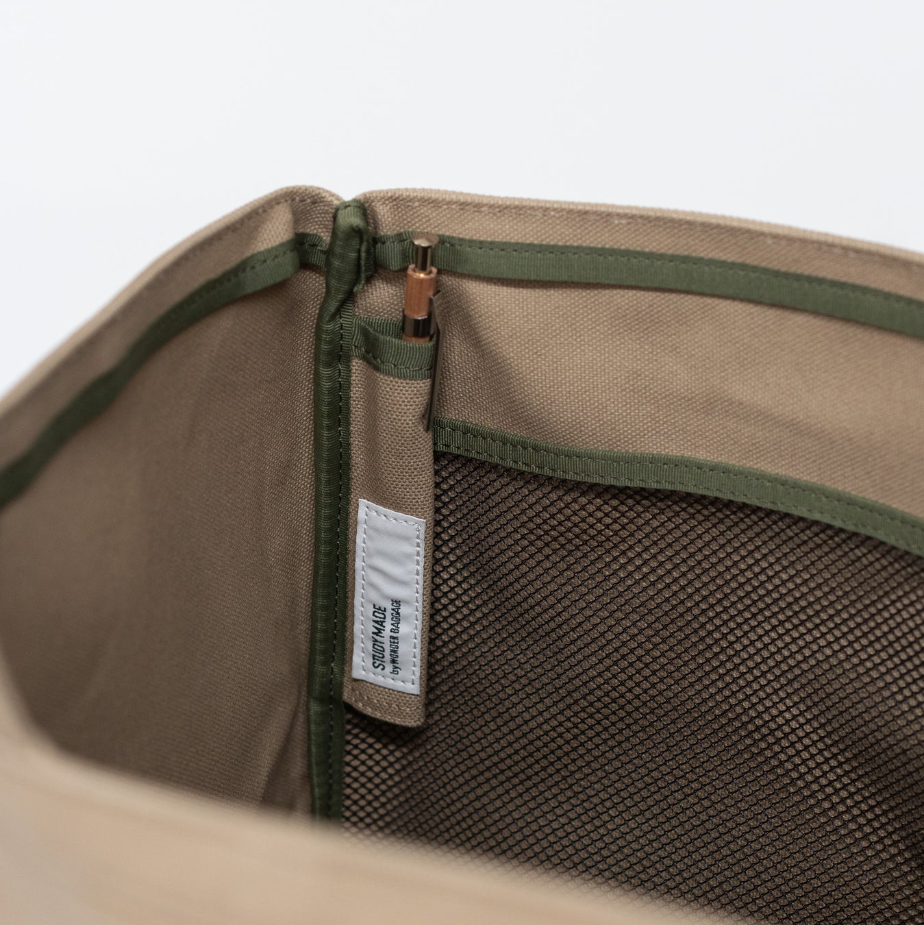 また、内装のテープは遊び心ある配色を採用、ポケットの内側はメッシュに仕上がっており、外ポケットに入れたものが中からでもわかるようになっています。