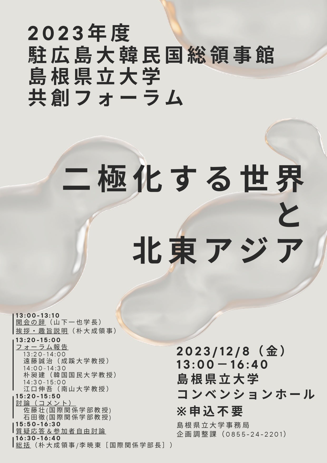 駐広島大韓民国総領事館主催、島根県立大学国際関係学部協力のもと『2023年度駐広島大韓民国総領事館・島根県立大学共創フォーラム』を島根県立大学浜田キャンパスコンベンションホールにて開催します。「二極化する世界と北東アジア」をテーマに3名のフォーラム報告と討論が行われます。一般の方もご参加いただけます。(事前申し込み不要)