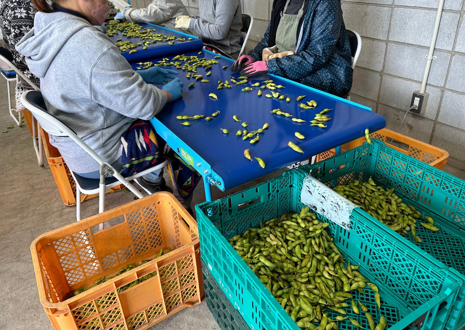 その後アグリヘルシーファームの農場にも訪問し、収穫の様子を見学し、枝豆の選別作業を体験しました。