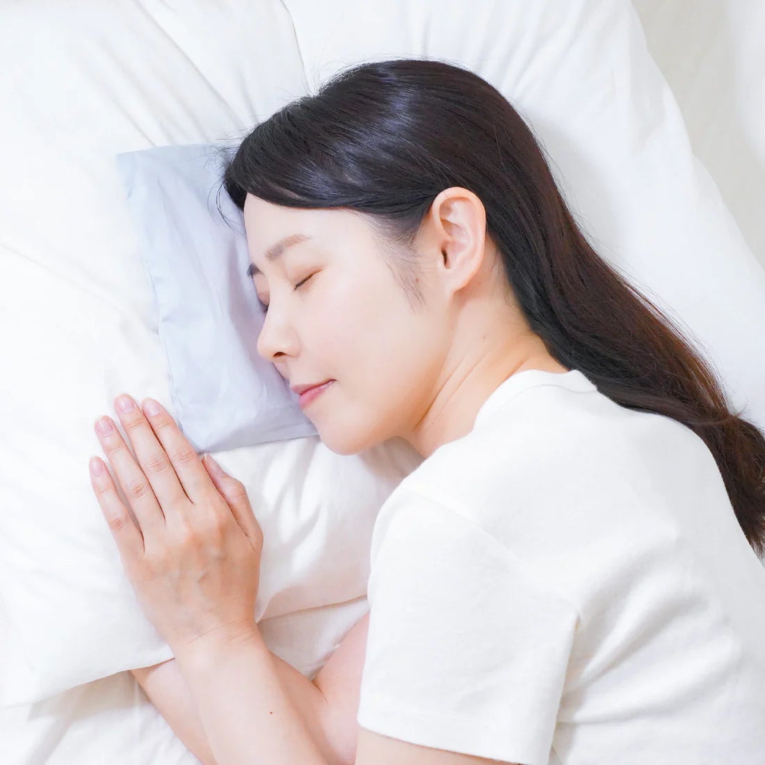 横向きで寝る方は耳の上に当てるように載せてください。