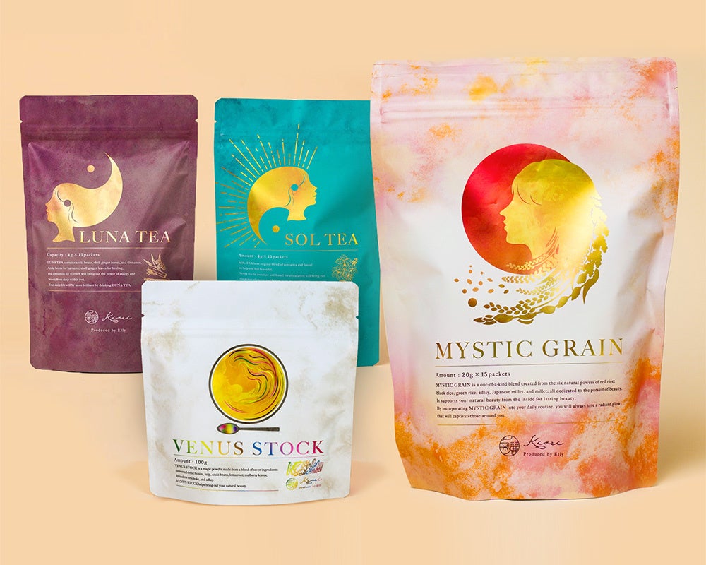 Ellyの主要メソッドとなる体質によって使い分けるオリジナルブレンドティー、2022年12月に発売した第一弾商品陰性のお茶「LUNA TEA」、1月に発売した陽性のお茶第二弾「SOL TEA」は共に発売時即完。第三弾の「VENUS STOCK」と併せて使える「TOPAZ MISO」も販売後大好評でどちらも再販を繰り返す氣麗の主軸アイテムとなっています。そして2024年7月に発売した、古代米・雑穀MIXの「MYSTIC GRAIN」、2025年4月にはオリジナルブレンドあずきパウダー「RESET CHARM」をリリースし、多くのお客様にリピートいただいております。また、初めて東洋医学の”養生”をベースにした生活・ダイエットに取り組む方におすすめな「NEW!!ケの日セット」は、届いたその日から養生が始められるキットになっており大変ご好評いただいております。