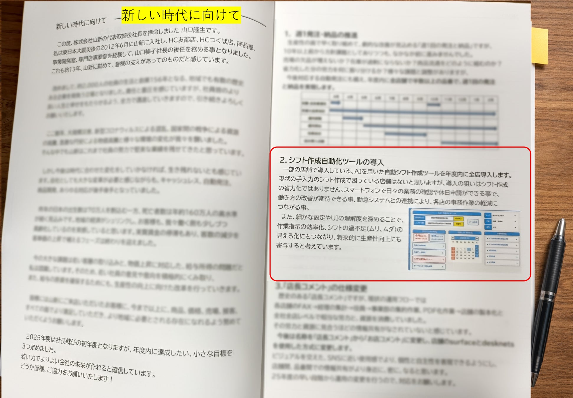 しかし、中長期的に見れば、茨城県全体の労働人口の減少や高齢化、最低賃金の上昇など、環境は待ってくれません。何もしなければ先細る。経営視点で見れば、可視化や業務改善は必至です。一方で現場が敏感に感じ取るのは「効率化=人を減らす話では?」という不安です。地元雇用を守りたい、できるだけ働いてほしい、接客の質を落としたくない。その思いが強い会社ほど、改善の取り組みは誤解されやすい。このジレンマを越えなければ、シフト管理の活用は“進めたくても進まないテーマ”になってしまいます。山新はシフトまわりの業務改善は2021年ごろから検討してはいたもののなかなか踏み出すに至らなかった現実がありました。