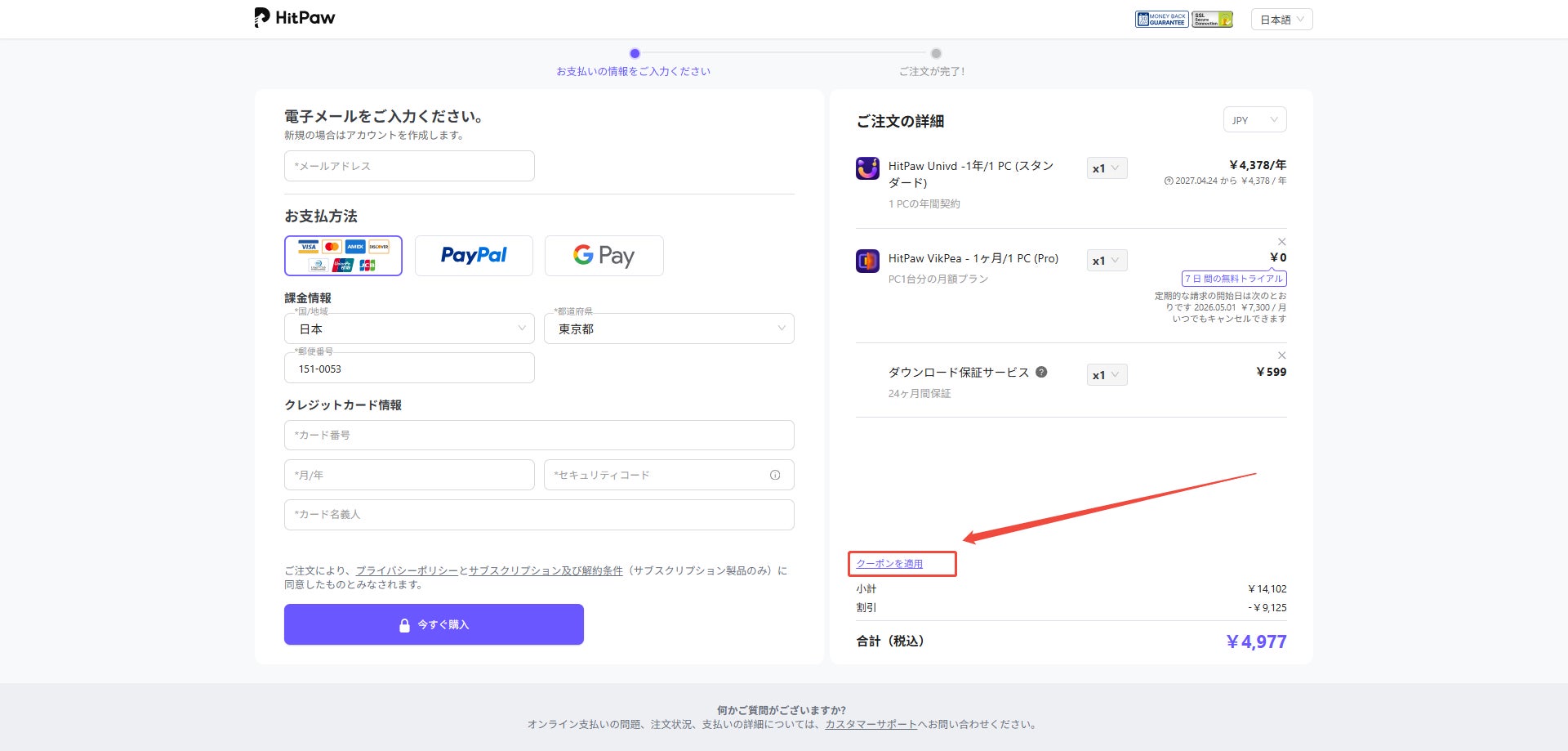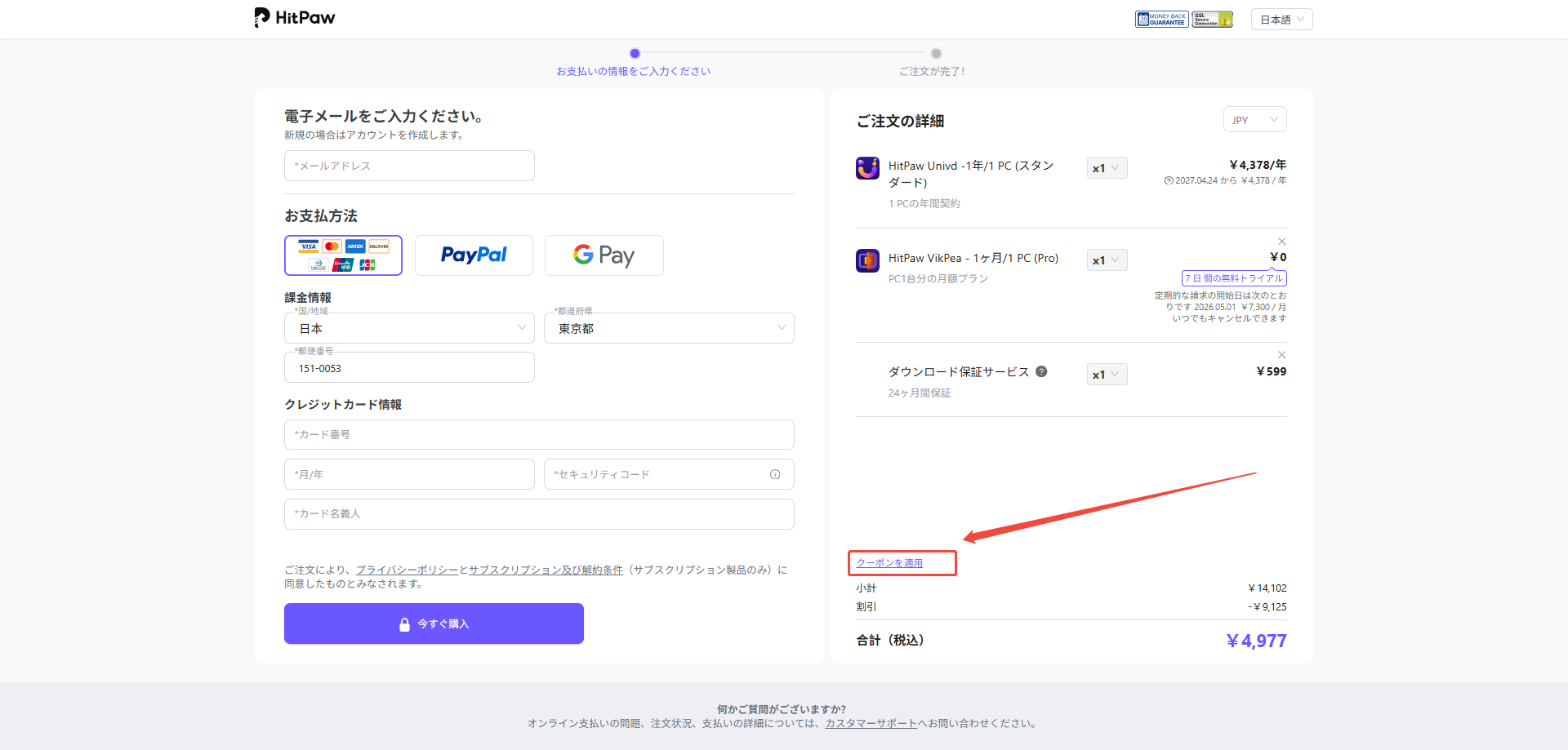 クーポンの適用: 決済情報の入力画面にある「クーポンコード」欄に貼り付け、適用ボタンを押すことで割引価格が反映されます。