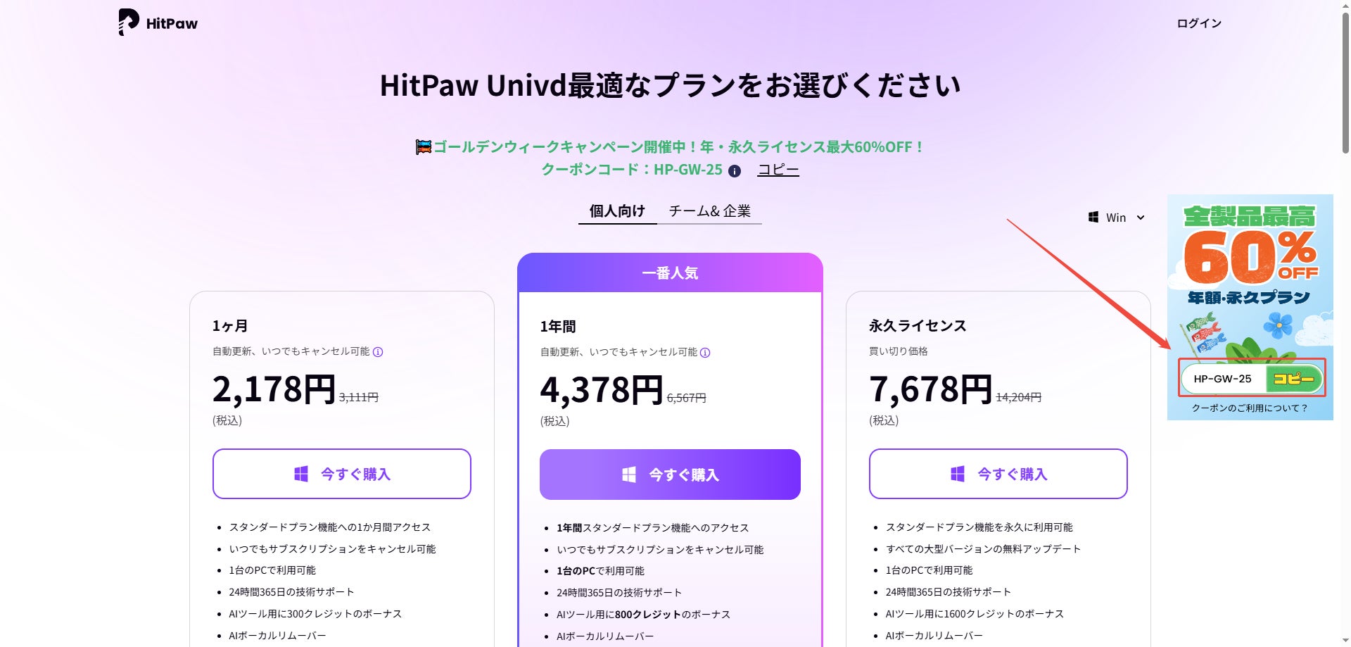 ゴールデンウィーク特別価格を適用するには、以下の2つの方法があります。