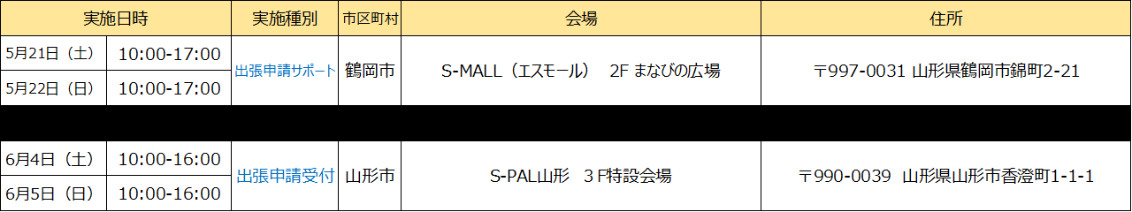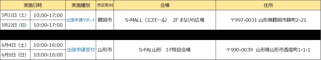※開催場所の調整状況や新型コロナウィルスの感染状況等により、「出張申請受付」及び「出張申請サポート」の開催を中止・延期、または実施内容が変更となる可能性がございます。