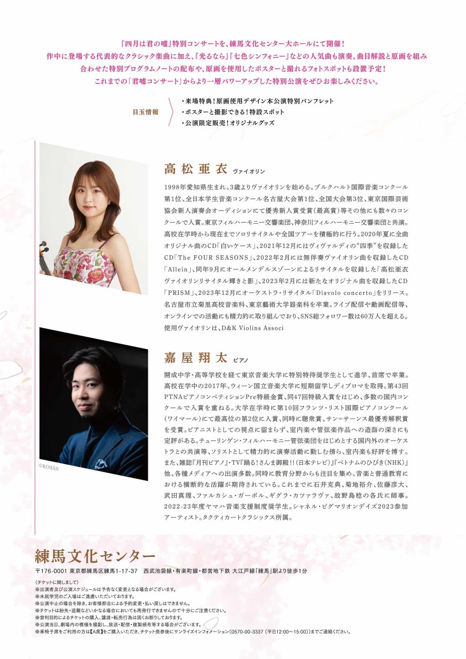 確かな実力と今後のクラシック音楽を担う若手として注目を集める二人の音楽家による演奏と、これまでの「君嘘コンサート」からより一層パワーアップした特別公演をぜひお楽しみください!