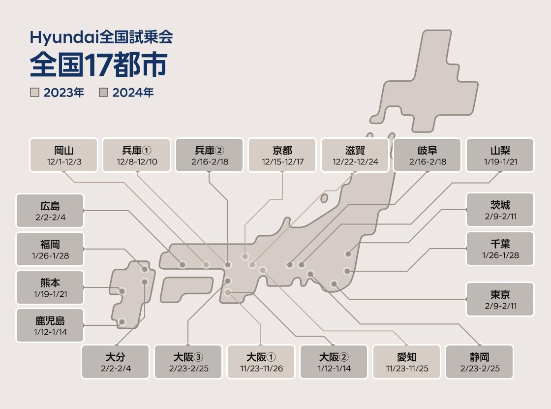 2022年6月から9月にかけて全国10都市で開催した「Hyundai IONIQ 5 & NEXO Hyundai 全国試乗会」では、多くのお客様にご来場およびご試乗をいただきました。昨年に続き、全国各地のお客様からのご要望にお応えし、今年は開催都市を増やし、全国各地(愛知、大阪(3回)、岡山、兵庫(2回)、京都、滋賀、鹿児島、熊本、山梨、福岡、千葉、広島、大分、東京、茨城、岐阜、静岡)で計20回に渡り開催します。