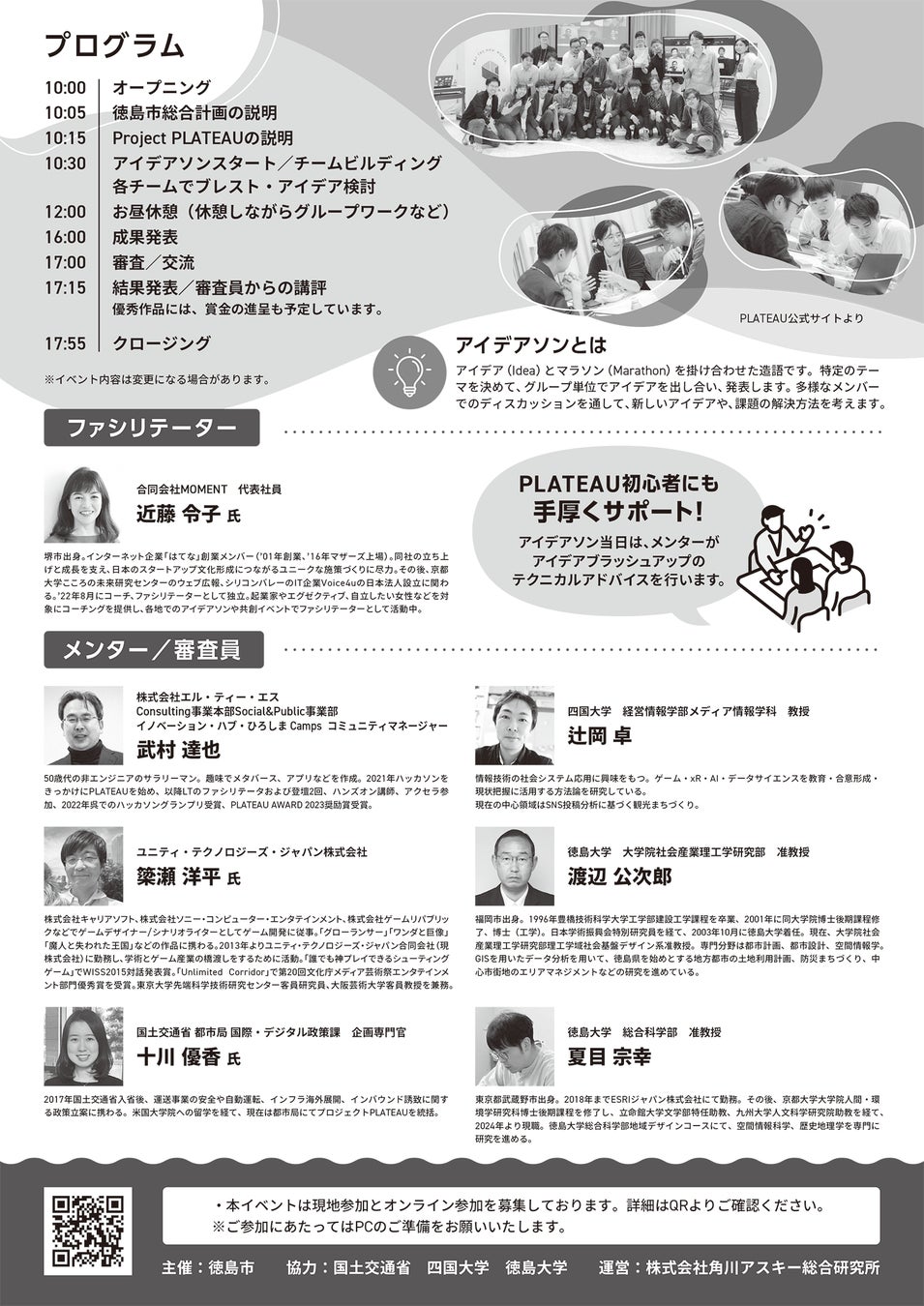 本イベントは、日本全国で整備が進んでいる3D都市モデルのオープンデータ(PLATEAU)を活用し、徳島市の魅力発信、市民の安全安心、生活利便性の向上などのさまざまな課題解決・施策推進のアイデアを提案する場です。