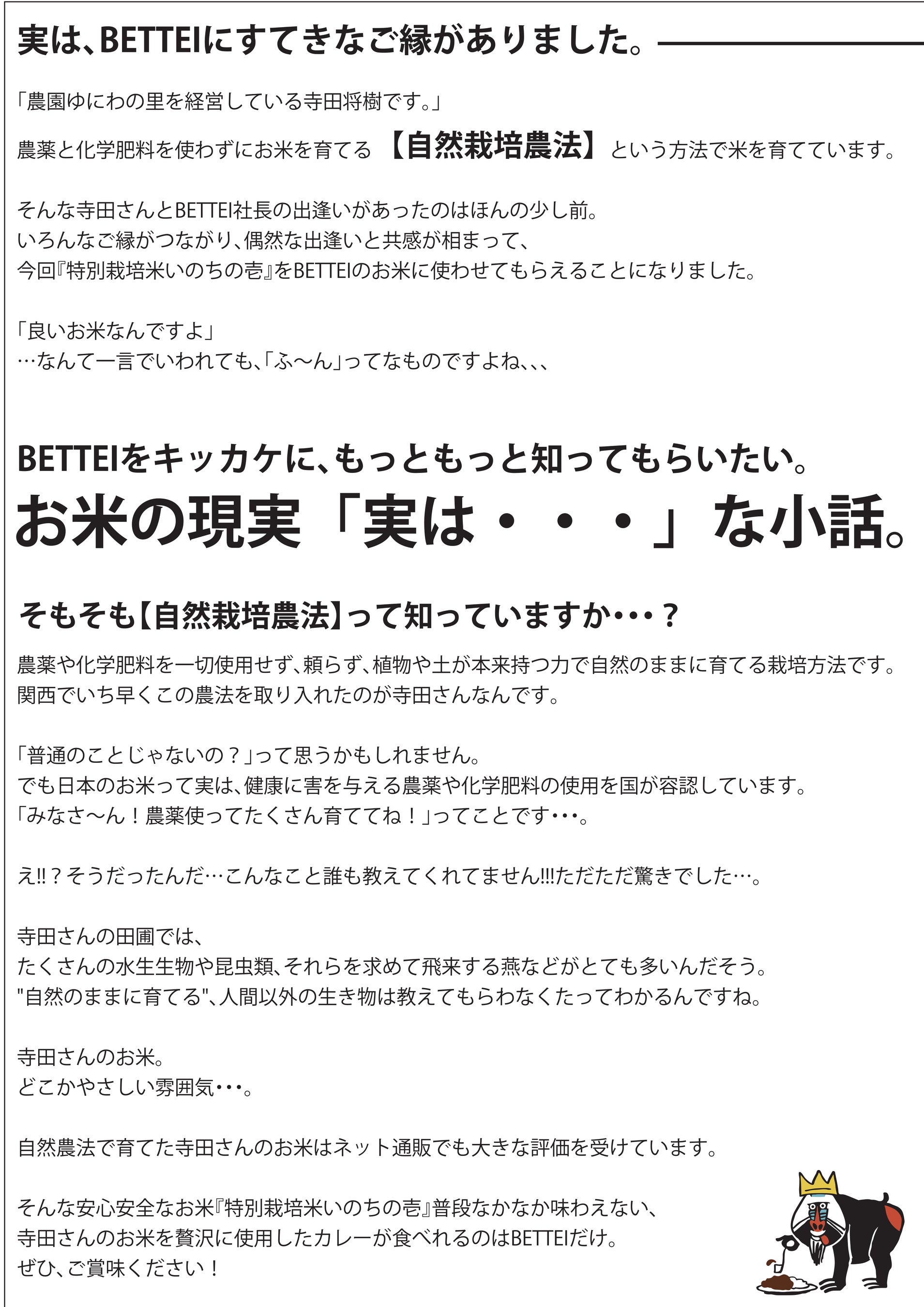 そんな安心安全なお米『自然栽培米いのちの壱』普段なかなか味わえない、寺田さんのお米を贅沢に使用したカレーが食べれるのはBETTEIだけ。