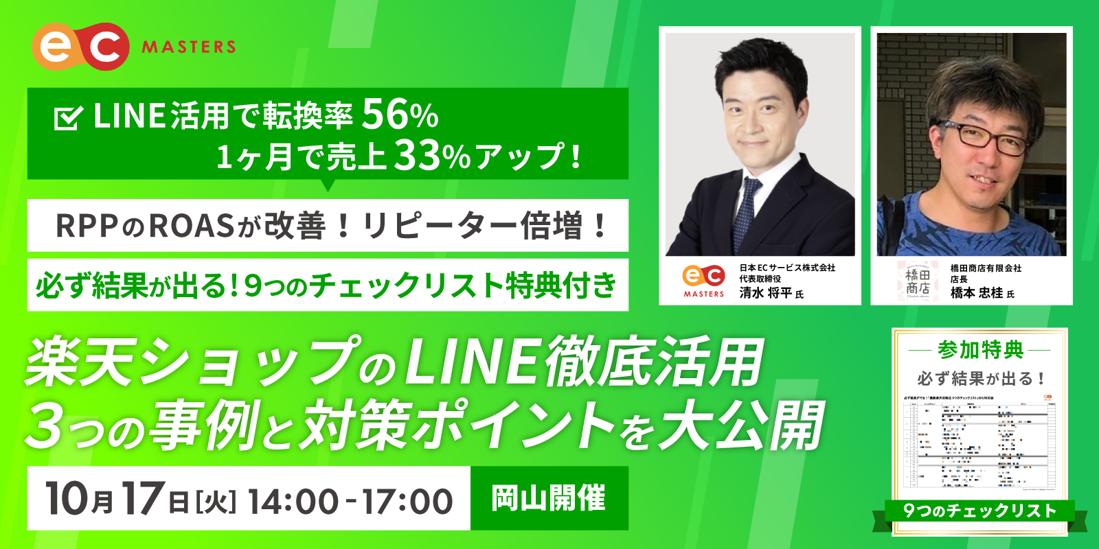 日本ECサービス株式会社は「ECマスターズクラブ」というネットショップのための会員制サポートサービスを運営しており、楽天ショップ約56,000ショップの22社に1社、日本全国2,500社以上、10,000人以上の会員様にご利用いただいております。コロナ禍も落ち着き昨年からリアル会場限定の「公開コンサルティング」を再開しています。今回は、戦略的LINE活用でLINE経由の売上が最大12倍になった「橋田商店」橋本様をお招きしており、実際の楽天ショップ運営者の声も聞くことが出来ます。ネットショップ運営の日頃のお悩みを解決したり、近隣のショップ様とのネットワークを広げる場としても貴重な機会ですので、是非ご参加をお待ちしています。