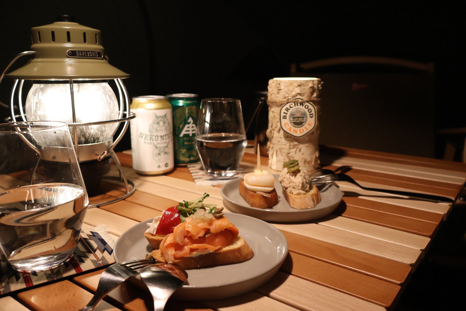 農園レストランnouniyellが提供するマルゲリータ、ミニハッシュドポテト、生ハムのシーザーサラダ、三重県の地ビール、ソフトドリンクをご用意いたします。VISON内のマルシェヴィソンやスウィーツヴィレッジなどでご購入されたお食事をお部屋に持ち帰り、お楽しみいただく事も可能です。テント内でパーティー気分を味わいながら、非日常体験をお楽しみください。