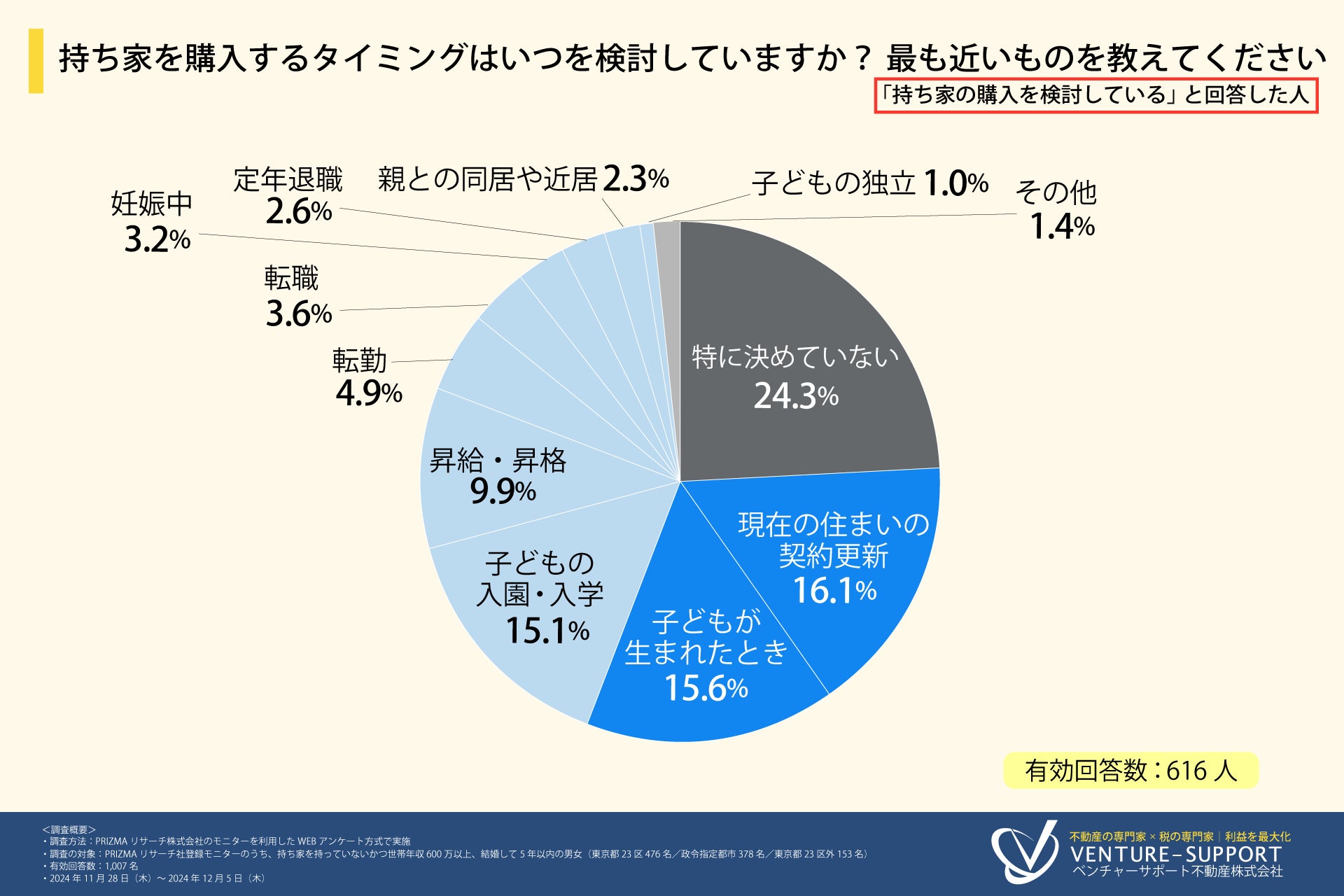 「持ち家を購入するタイミングはいつを検討していますか?最も近いものを教えてください」と質問したところ、「特に決めていない(24.3%)」と回答した人が最も多く、次いで「現在の住まいの契約更新(16.1%)」「子どもが生まれたとき(15.6%)」「子どもの入園・入学(15.1%)」「昇給・昇格(9.9%)」「転勤(4.9%)」「転職(3.6%)」「妊娠中(3.2%)」「定年退職(2.6%)」「親との同居や近居(2.3%)」「子どもの独立(1.0%)」「その他(1.4%)」という回答結果となった。