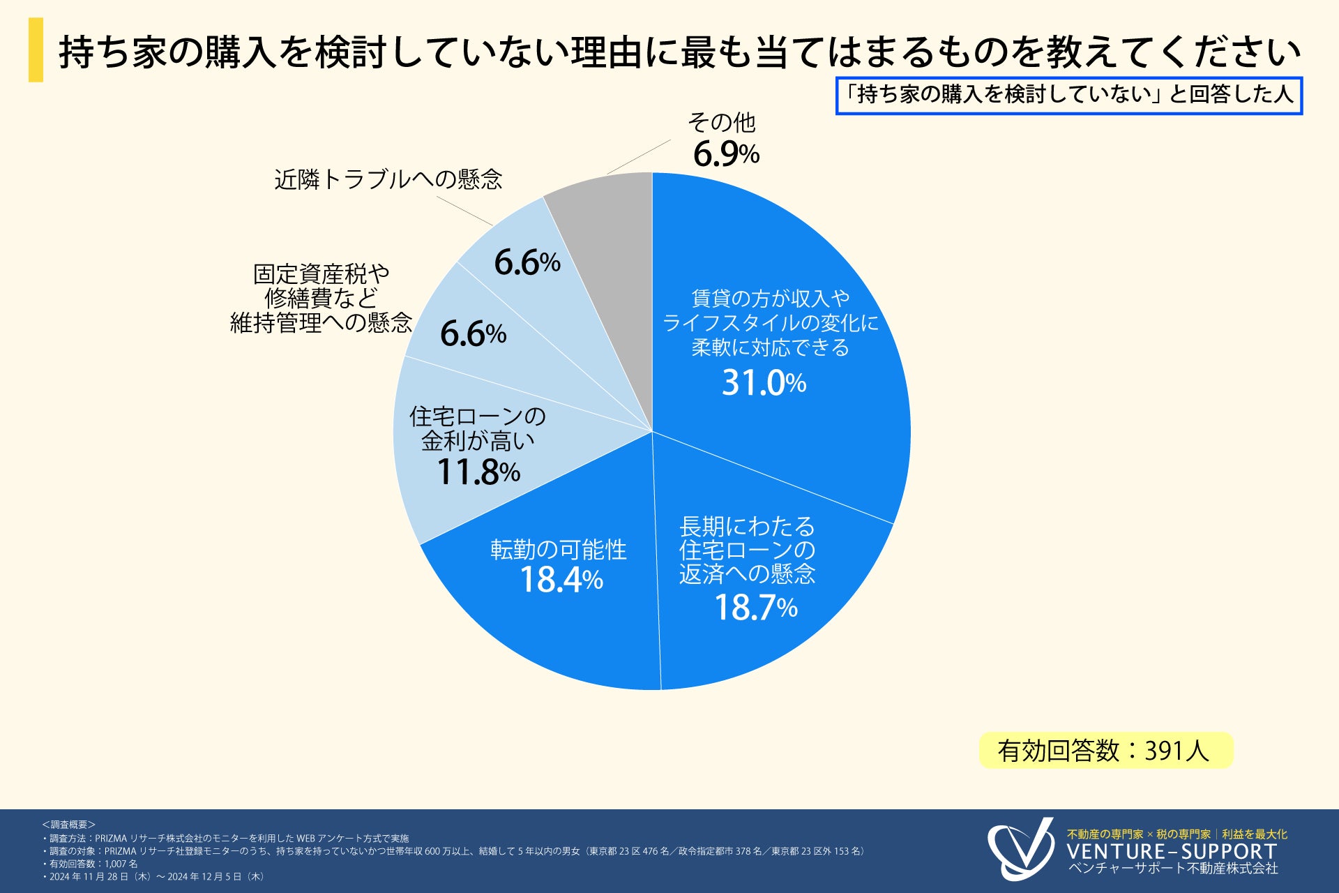 持ち家の購入を検討していないと回答した人に、「持ち家の購入を検討していない理由に最も当てはまるものを教えてください」と質問したところ、「賃貸の方が収入やライフスタイルの変化に柔軟に対応できる(31.0%)」と回答した人が最も多く、次いで「長期にわたる住宅ローンの返済への懸念(18.7%)」「転勤の可能性(18.4%)」「住宅ローンの金利が高い(11.8%)」「固定資産税や修繕費など維持管理への懸念(6.6%)」「近隣トラブルへの懸念(6.6%)」「その他(6.9%)」という回答結果となった。