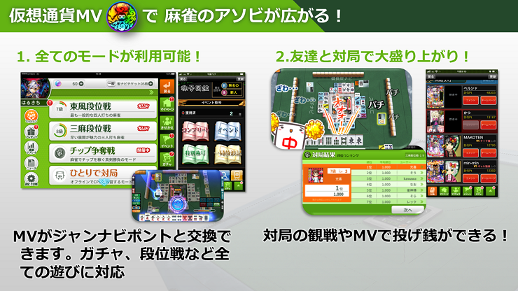ジャンナビ全てのゲームモードが遊べます。仮想通貨で投げ銭やイベントに参加できるようになり、